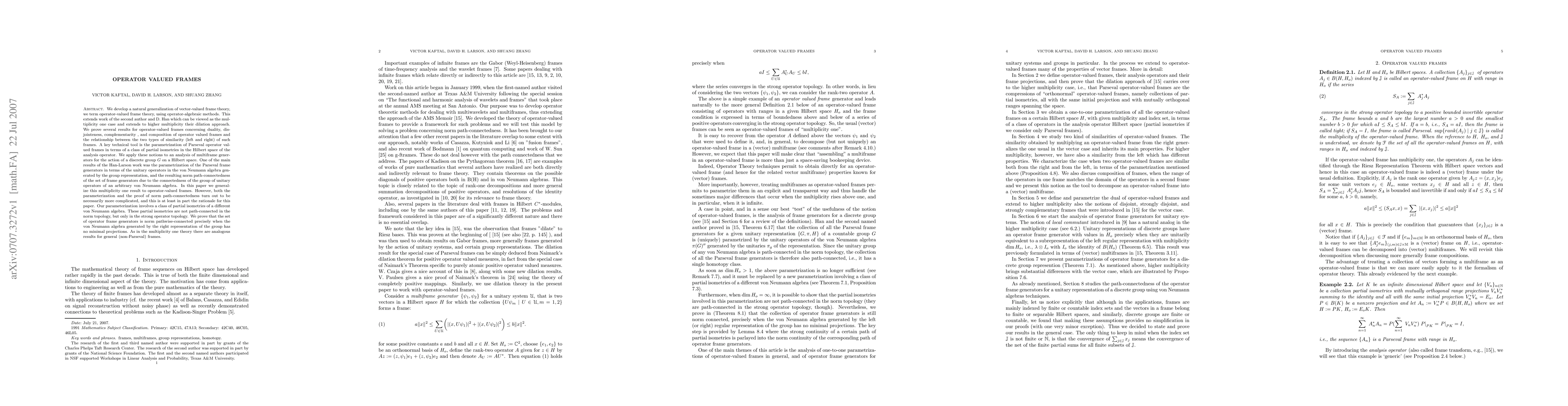 This paper generalizes vector-valued frame theory to operator-valued frames, exploring parametrization, duality, and composition, and proves that multiframe generators for a discrete group action are norm pathwise-connected if the generated von Neumann algebra has no minimal projections. It distinguishes between left and right frame similarities.