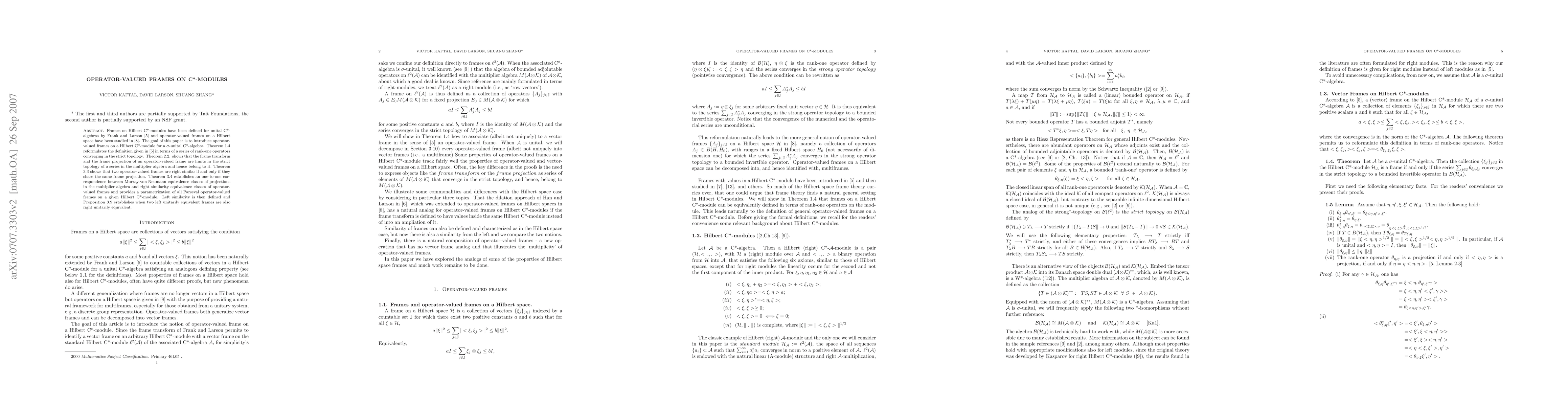 This paper introduces operator valued frames on Hilbert C*-modules for sigma-unital C*-algebras, reformulating the existing definition via rank-one operators. It establishes the relationship between frame transforms, frame projections, and multiplier algebra elements, proving right similarity and providing a one-to-one correspondence between projection equivalence classes and frame equivalence classes.