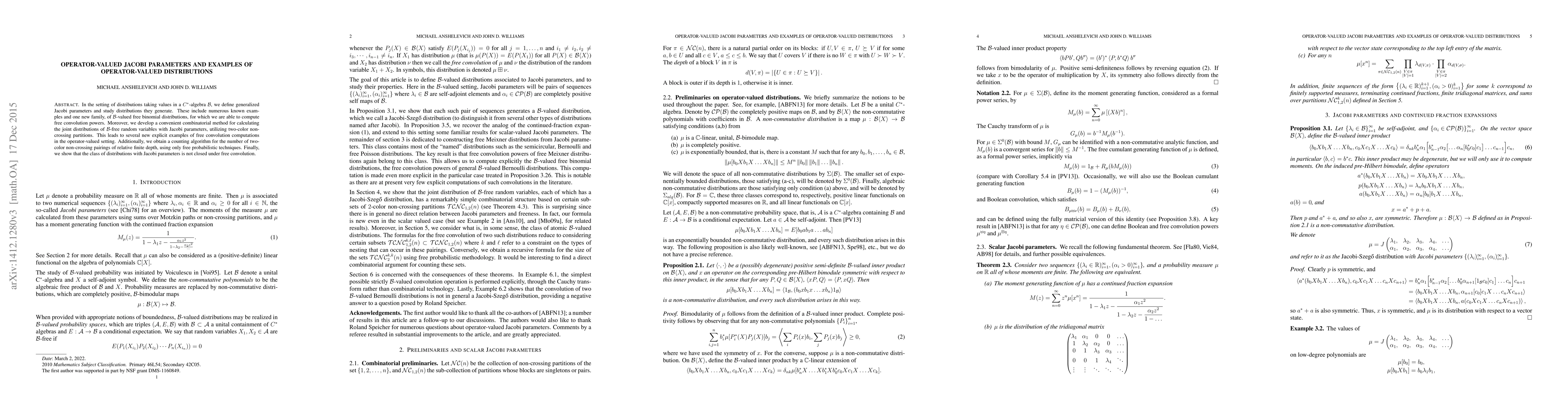 This paper defines generalized Jacobi parameters for distributions in a $C^\ast$-algebra and studies the operator-valued distributions they generate, including $\mathcal{B}$-valued free binomial distributions. It also introduces a combinatorial method for computing joint distributions using two-color non-crossing partitions and presents a counting algorithm for two-color non-crossing pairings.