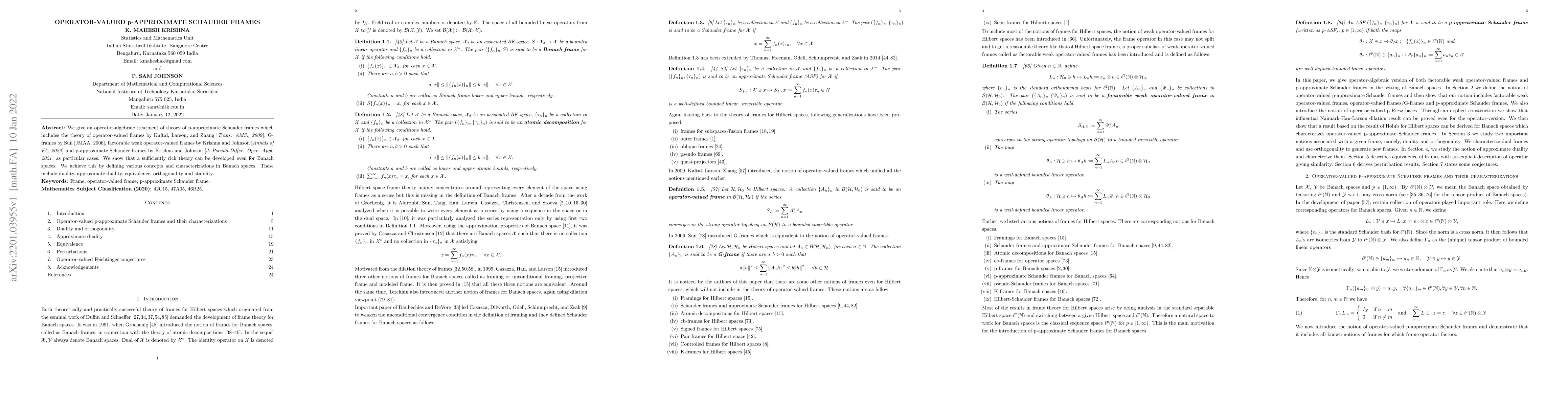 This paper explores operator-algebraic aspects of p-approximate Schauder frames, encompassing previous theories like operator-valued frames, G-frames, and factorable weak operator-valued frames. It develops a comprehensive framework for Banach spaces, introducing concepts such as duality, equivalence, and stability.