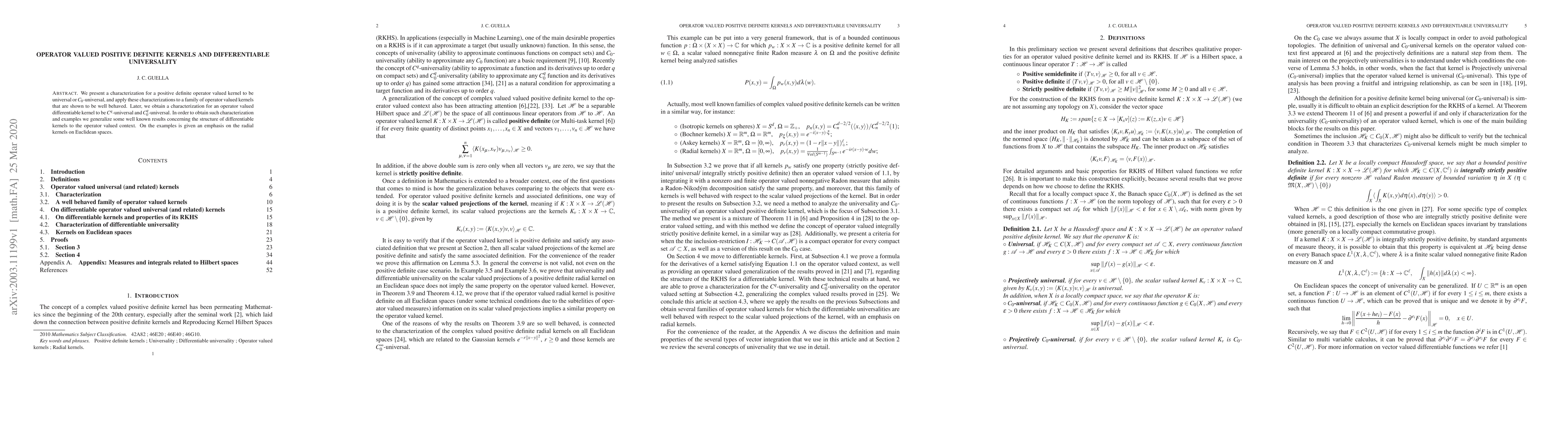 This paper characterizes operator valued positive definite kernels for universality and differentiable universality, applying these characterizations to a family of well-behaved kernels. It also generalizes known results on differentiable kernels to the operator valued context, with a focus on radial kernels on Euclidean spaces.