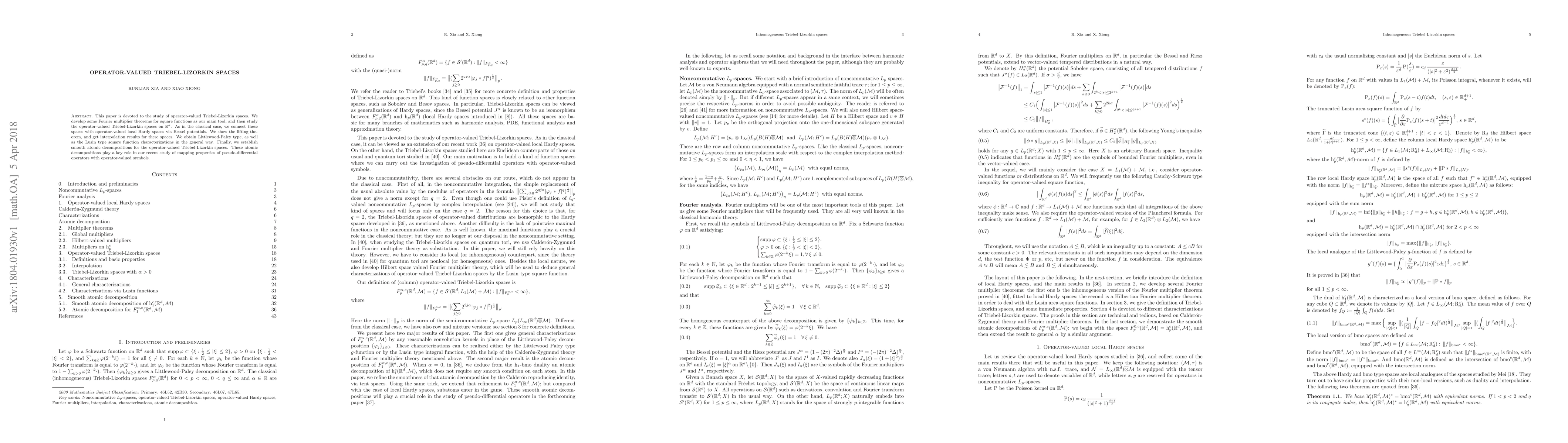 This paper is devoted to the study of operator-valued Triebel-Lizorkin spaces. We develop some Fourier multiplier theorems for square functions as our main tool, and then study the operator-valued Triebel-Lizorkin spaces on $\mathbb{R}^d$. As in the classical case, we connect these spaces with operator-valued local Hardy spaces via Bessel potentials. We show the lifting theorem, and get interpolation results for these spaces. We obtain Littlewood-Paley type, as well as the Lusin type square function characterizations in the general way. Finally, we establish smooth atomic decompositions for the operator-valued Triebel-Lizorkin spaces. These atomic decompositions play a key role in our recent study of mapping properties of pseudo-differential operators with operator-valued symbols.