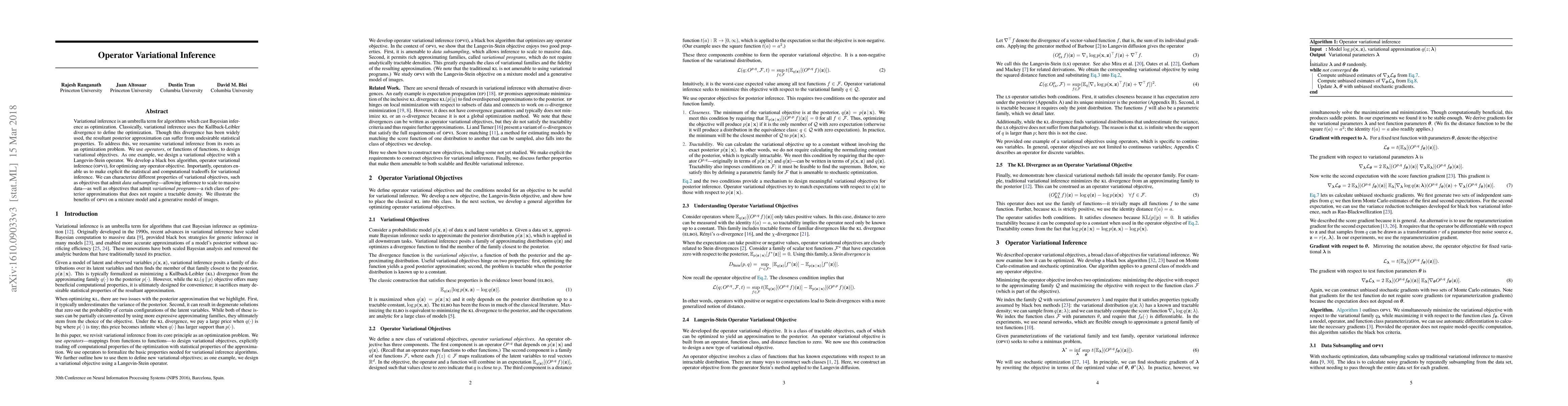 Operator Variational Inference (OPVI) introduces a novel approach to variational inference using operators to design optimization objectives, enabling explicit characterization of statistical and computational tradeoffs. OPVI demonstrates scalability and flexibility, exemplified by its application to mixture models and image generative models.