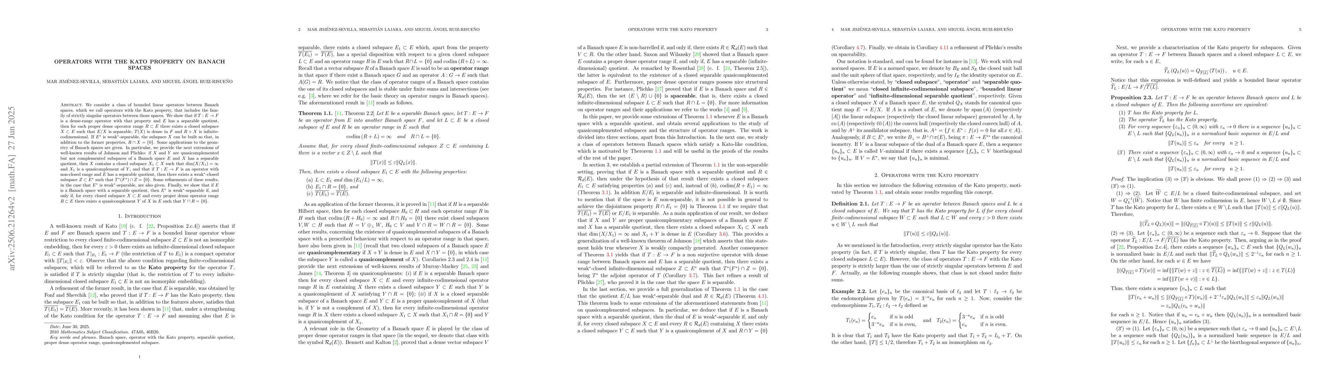 We consider a class of bounded linear operators between Banach spaces, which we call operators with the Kato property, that includes the family of strictly singular operators between those spaces. We show that if $T:E\to F$ is a dense-range operator with that property and $E$ has a separable quotient, then for each proper dense operator range $R\subset E$ there exists a closed subspace $X\subset E$ such that $E/X$ is separable, $T(X)$ is dense in $F$ and $R+X$ is infinite-codimensional. If $E^*$ is weak$^*$-separable, the subspace $X$ can be built so that, in addition to the former properties, $R\cap X = \{0\}$. Some applications to the geometry of Banach spaces are given. In particular, we provide the next extensions of well-known results of Johnson and Plichko: if $X$ and $Y$ are quasicomplemented but not complemented subspaces of a Banach space $E$ and $X$ has a separable quotient, then $X$ contains a closed subspace $X_1\subset X$ such that $\dim (X/X_1)= \infty$ and $X_1$ is a quasicomplement of $Y$, and that if $T:E\to F$ is an operator with non-closed range and $E$ has a separable quotient, then there exists a weak$^*$-closed subspace $Z\subset E^*$ such that $T^*(F^*)\cap Z = \{0\}$. Some refinements of these results, in the case that $E^*$ is weak$^*$-separable, are also given. Finally, we show that if $E$ is a Banach space with a separable quotient, then $E^*$ is weak$^*$-separable if, and only if, for every closed subspace $X\subset E$ and every proper dense operator range $R\subset E$ there exists a quasicomplement $Y$ of $X$ in $E$ such that $Y\cap R = \{0\}$.