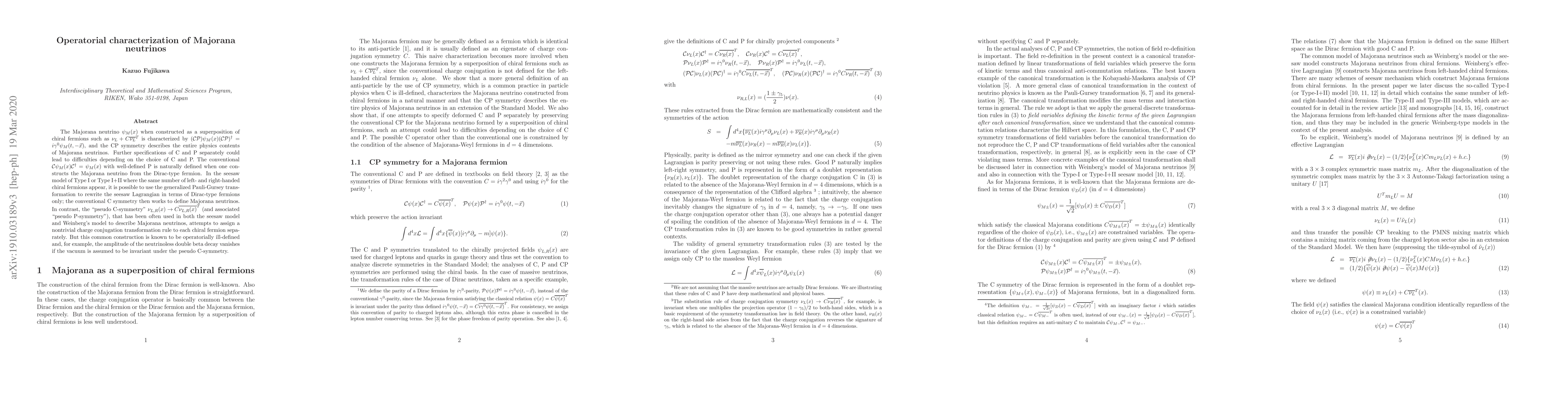 The Majorana neutrino $\psi_{M}(x)$ when constructed as a superposition of chiral fermions such as $\nu_{L} + C\overline{\nu_{L}}^{T}$ is characterized by $ ({\cal C}{\cal P}) \psi_{M}(x)({\cal C}{\cal P})^{\dagger} =i\gamma^{0}\psi_{M}(t,-\vec{x})$, and the CP symmetry describes the entire physics contents of Majorana neutrinos. Further specifications of C and P separately could lead to difficulties depending on the choice of C and P. The conventional $ {\cal C} \psi_{M}(x) {\cal C}^{\dagger} = \psi_{M}(x)$ with well-defined P is naturally defined when one constructs the Majorana neutrino from the Dirac-type fermion. In the seesaw model of Type I or Type I+II where the same number of left- and right-handed chiral fermions appear, it is possible to use the generalized Pauli-Gursey transformation to rewrite the seesaw Lagrangian in terms of Dirac-type fermions only; the conventional C symmetry then works to define Majorana neutrinos. In contrast, the "pseudo C-symmetry" $\nu_{L,R}(x)\rightarrow C\overline{\nu_{L,R}(x)}^{T}$ (and associated "pseudo P-symmetry"), that has been often used in both the seesaw model and Weinberg's model to describe Majorana neutrinos, attempts to assign a nontrivial charge conjugation transformation rule to each chiral fermion separately. But this common construction is known to be operatorially ill-defined and, for example, the amplitude of the neutrinoless double beta decay vanishes if the vacuum is assumed to be invariant under the pseudo C-symmetry.