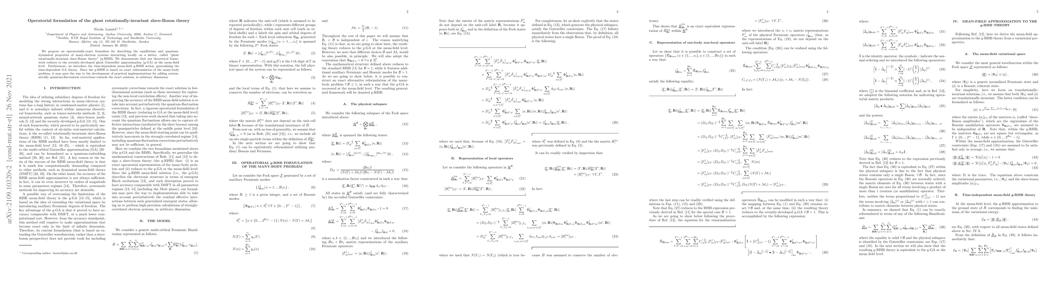 This paper proposes an operatorially-exact formalism, the ghost rotationally-invariant slave-Boson theory (g-RISB), for describing many-electron systems on a lattice. It shows that the g-RISB reduces to the ghost Gutzwiller approximation at the mean-field level and introduces a time-dependent mean-field g-RISB action, potentially enabling systematic quantum-fluctuation corrections.