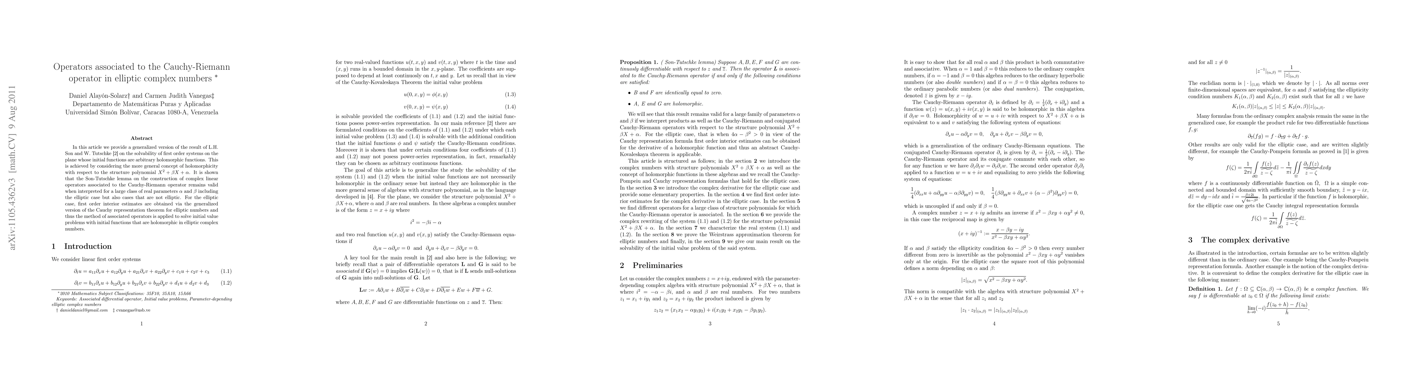 In this article we provide a generalized version of the result of L.H. Son and W. Tutschke \cite{tut} on the solvability of first order systems on the plane whose initial functions are arbitrary holomorphic functions. This is achieved by considering the more general concept of holomorphicity with respect to the structure polynomial $X^2 + \beta X + \alpha$. It is shown that the Son-Tutschke lemma on the construction of complex linear operators associated to the Cauchy-Riemann operator remains valid when interpreted for a large class of real parameters $\alpha$ and $\beta$ including the elliptic case but also cases that are not elliptic. For the elliptic case, first order interior estimates are obtained via the generalized version of the Cauchy representation theorem for elliptic numbers and thus the method of associated operators is applied to solve initial value problems with initial functions that are holomorphic in elliptic complex numbers.