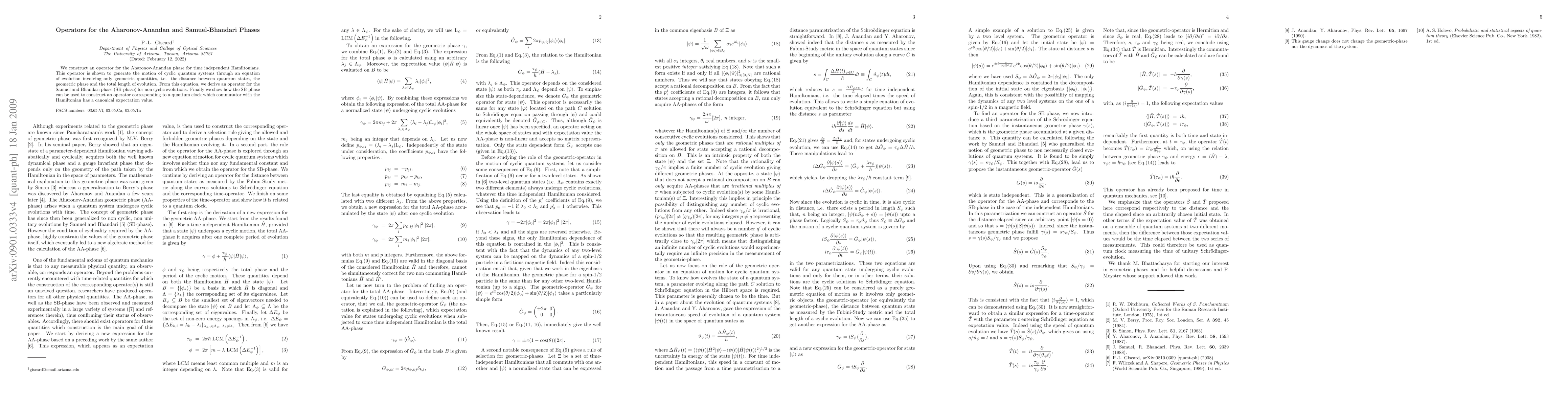 This paper constructs an operator for the Aharonov-Anandan phase for time-independent Hamiltonians, demonstrating its role in cyclic quantum system evolution. It also derives an operator for the Samuel-Bhandari phase and shows how the latter can construct a quantum clock operator.