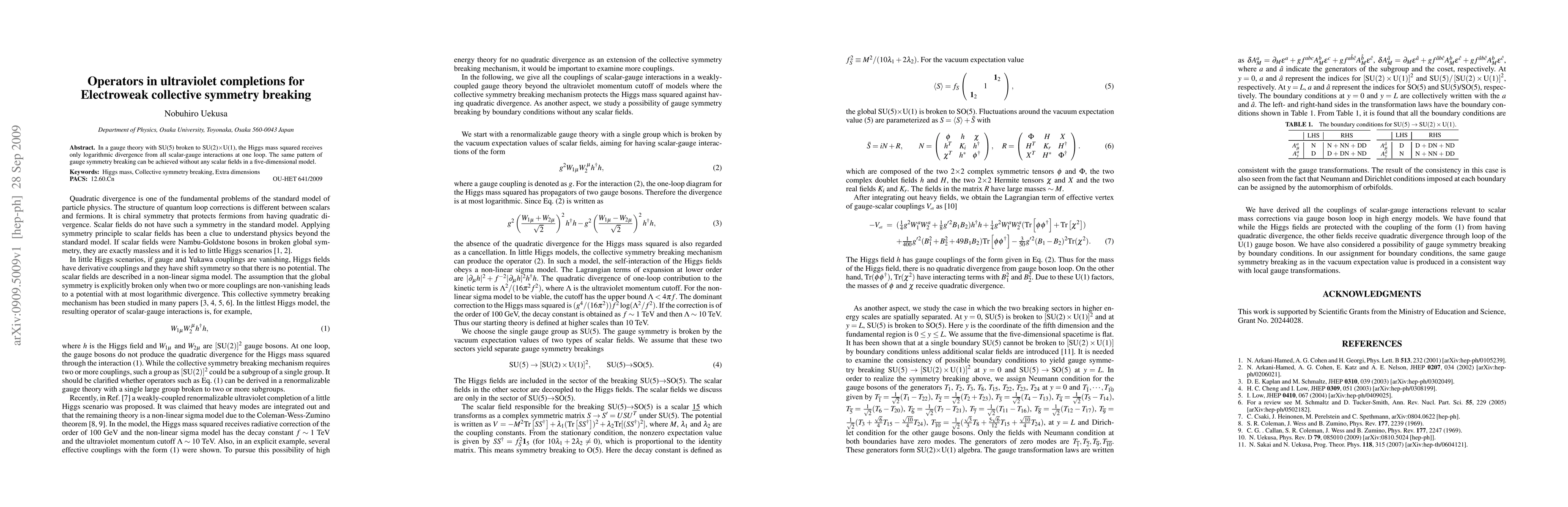 In a gauge theory with SU(5) broken to SU(2)$\times$U(1), the Higgs mass squared receives only logarithmic divergence from all scalar-gauge interactions at one loop. The same pattern of gauge symmetry breaking can be achieved without any scalar fields in a five-dimensional model.
