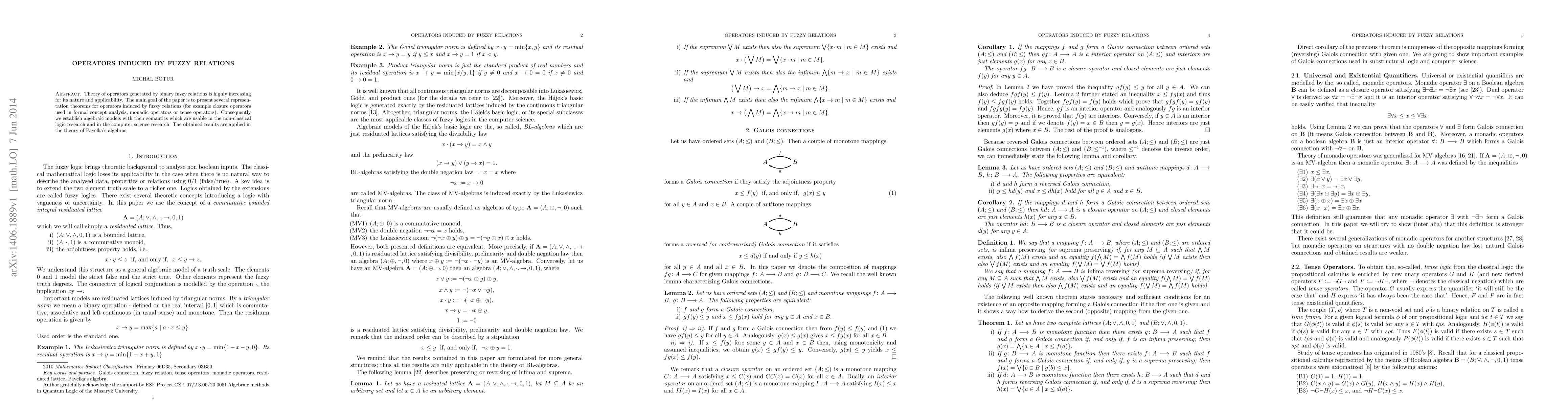 This paper presents representation theorems for operators generated by binary fuzzy relations, including closure, monadic, and tense operators, establishing algebraic models useful in non-classical logic and computer science, and applying these results to Pavelka's algebras.