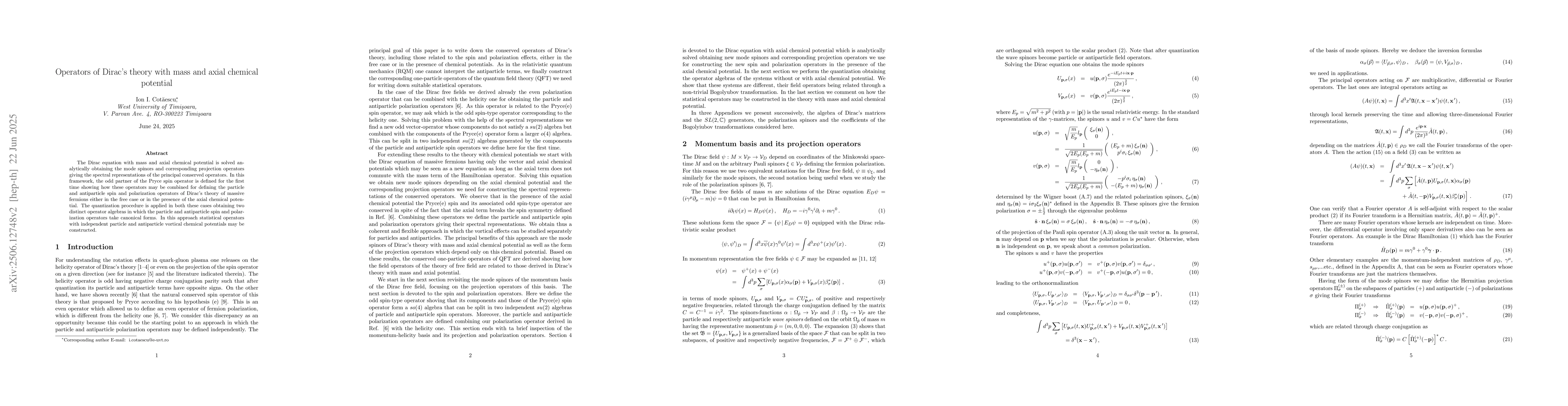 The Dirac equation with mass and axial chemical potential is solved analytically obtaining the mode spinors and corresponding projection operators giving the spectral representations of the principal conserved operators. In this framework, the odd partner of the Pryce spin operator is defined for the first time showing how these operators may be combined for defining the particle and antiparticle spin and polarization operators of Dirac's theory of massive fermions either in the free case or in the presence of the axial chemical potential. The quantization procedure is applied in both these cases obtaining two distinct operator algebras in which the particle and antiparticle spin and polarization operators take canonical forms. In this approach statistical operators with independent particle and antiparticle vortical chemical potentials may be constructed.