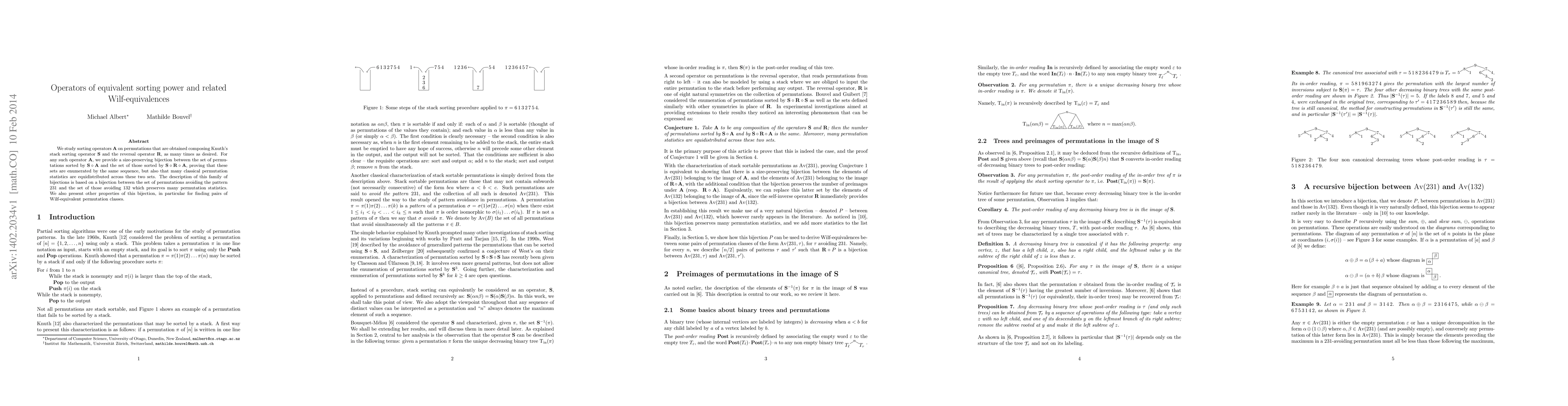 The study examines sorting operators A derived by composing Knuth's stack sorting operator S and the reversal operator R, proving properties through bijections.