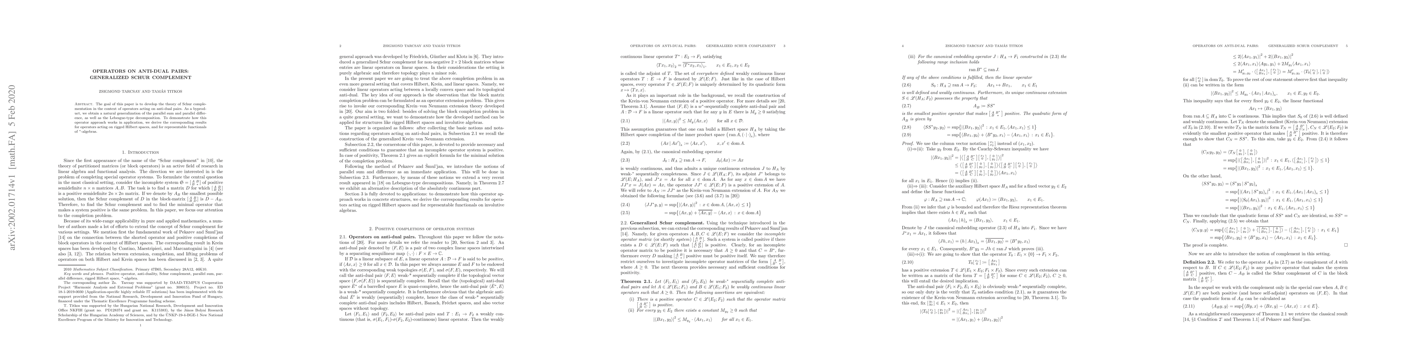 The goal of this paper is to develop the theory of Schur complementation in the context of operators acting on anti-dual pairs. As a byproduct, we obtain a natural generalization of the parallel sum and parallel difference, as well as the Lebesgue-type decomposition. To demonstrate how this operator approach works in application, we derive the corresponding results for operators acting on rigged Hilbert spaces, and for representable functionals of ${}^{*}$-algebras.