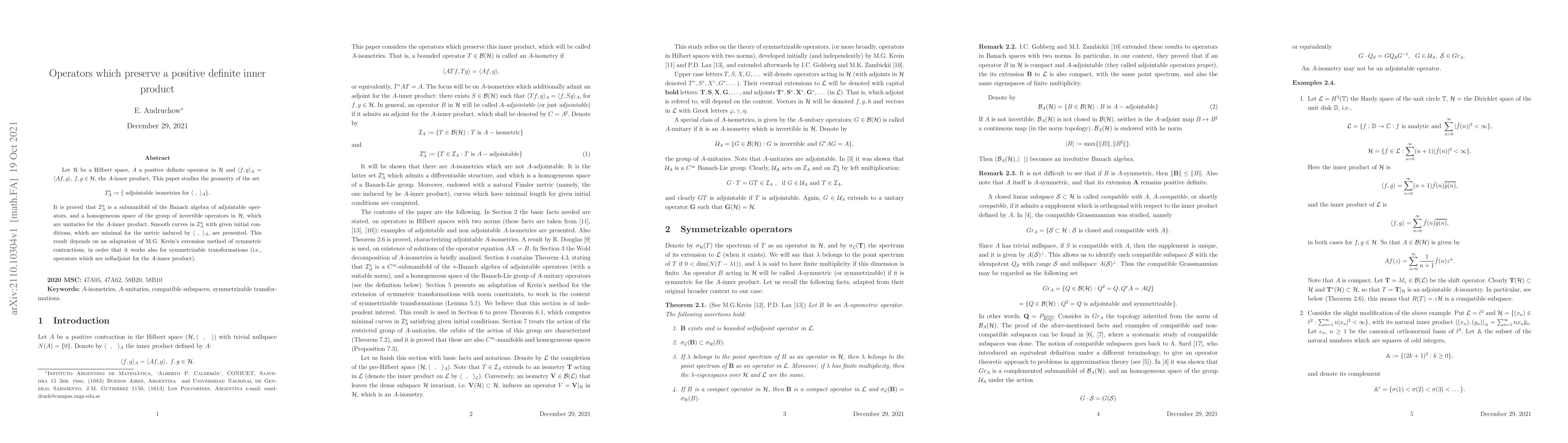 Let ${\cal H}$ be a Hilbert space, $A$ a positive definite operator in ${\cal H}$ and $\langle f,g\rangle_A=\langle Af,g\rangle$, $f,g\in {\cal H}$, the $A$-inner product. This paper studies the geometry of the set $$ {\cal I}_A^a:=\{\hbox{ adjointable isometries for } \langle \ , \ \rangle_A\}. $$ It is proved that ${\cal I}_A^a$ is a submanifold of the Banach algebra of adjointable operators, and a homogeneous space of the group of invertible operators in ${\cal H}$, which are unitaries for the $A$-inner product. Smooth curves in ${\cal I}_A^a$ with given initial conditions, which are minimal for the metric induced by $\langle \ , \ \rangle_A$, are presented. This result depends on an adaptation of M.G. Krein's extension method of symmetric contractions, in order that it works also for symmetrizable transformations (i.e., operators which are selfadjoint for the $A$-inner product).