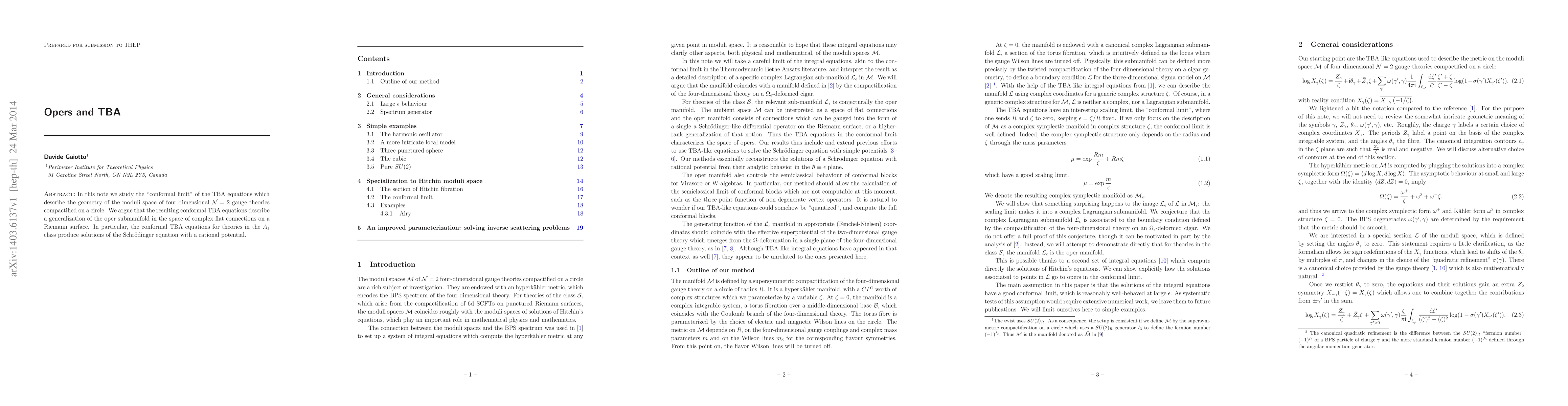 In this note we study the "conformal limit" of the TBA equations which describe the geometry of the moduli space of four-dimensional N=2 gauge theories compactified on a circle. We argue that the resulting conformal TBA equations describe a generalization of the oper submanifold in the space of complex flat connections on a Riemann surface. In particular, the conformal TBA equations for theories in the A1 class produce solutions of the Schr\"odinger equation with a rational potential.