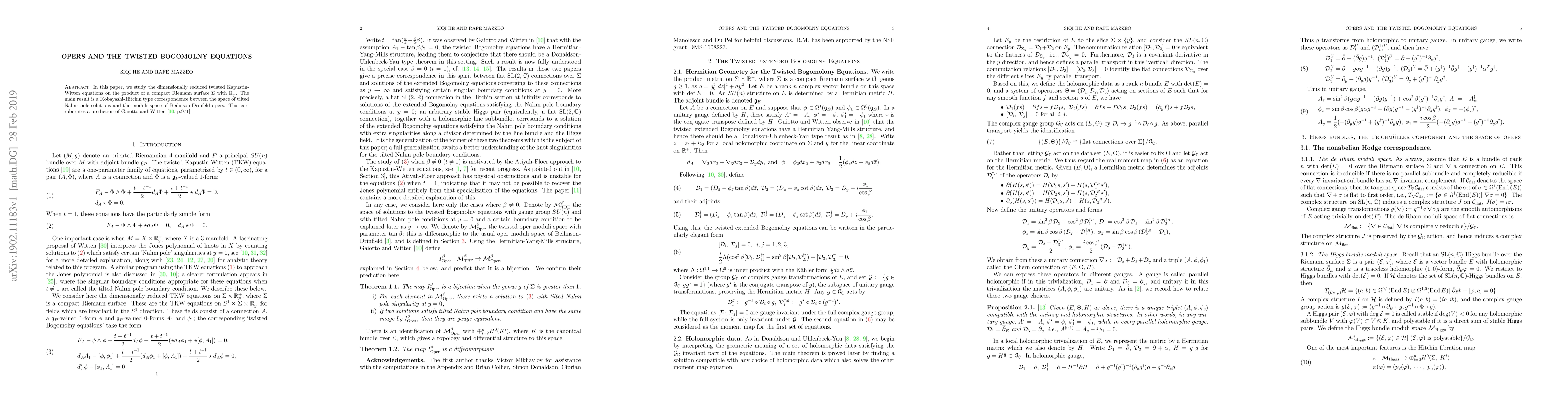 In this paper, we study the dimensionally reduced twisted Kapustin-Witten equations on the product of a compact Riemann surface $\Sigma$ with $\mathbb{R}^+$. The main result is a Kobayashi-Hitchin type correspondence between the space of tilted Nahm pole solutions and the moduli space of Beilinson-Drinfeld opers. This corroborates a prediction of Gaiotto and Witten \cite[p.971]{gaiotto2012knot}.