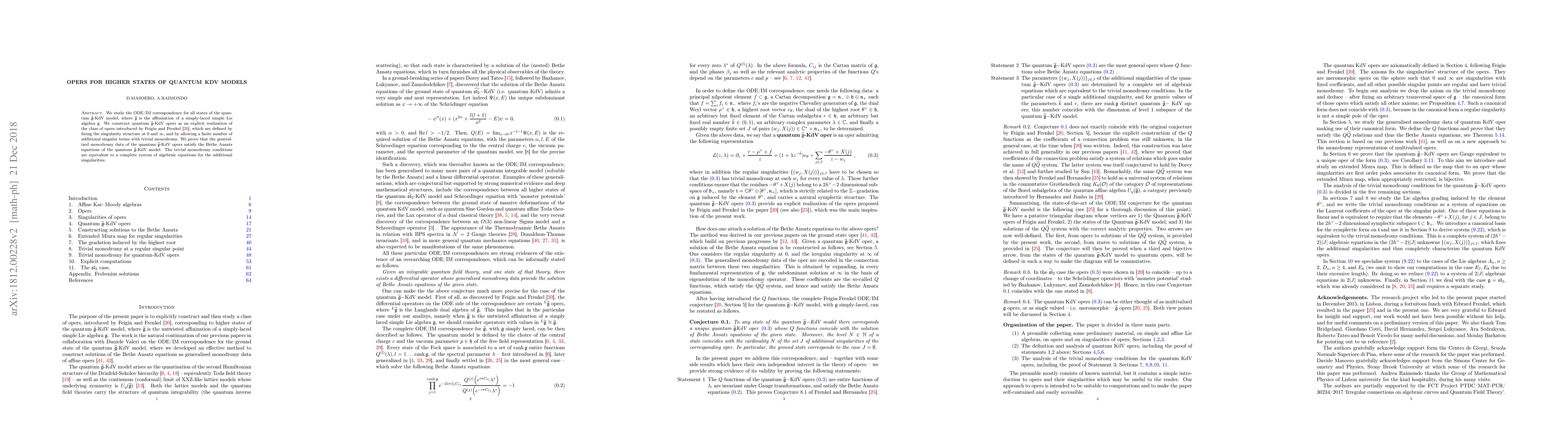 We study the ODE/IM correspondence for all states of the quantum $\widehat{\mathfrak{g}}$-KdV model, where $\widehat{\mathfrak{g}}$ is the affinization of a simply-laced simple Lie algebra $\mathfrak{g}$. We construct quantum $\widehat{\mathfrak{g}}$-KdV opers as an explicit realization of the class of opers introduced by Feigin and Frenkel, which are defined by fixing the singularity structure at $0$ and $\infty$, and by allowing a finite number of additional singular terms with trivial monodromy. We prove that the generalized monodromy data of the quantum $\widehat{\mathfrak{g}}$-KdV opers satisfy the Bethe Ansatz equations of the quantum $\widehat{\mathfrak{g}}$-KdV model. The trivial monodromy conditions are equivalent to a complete system of algebraic equations for the additional singularities.