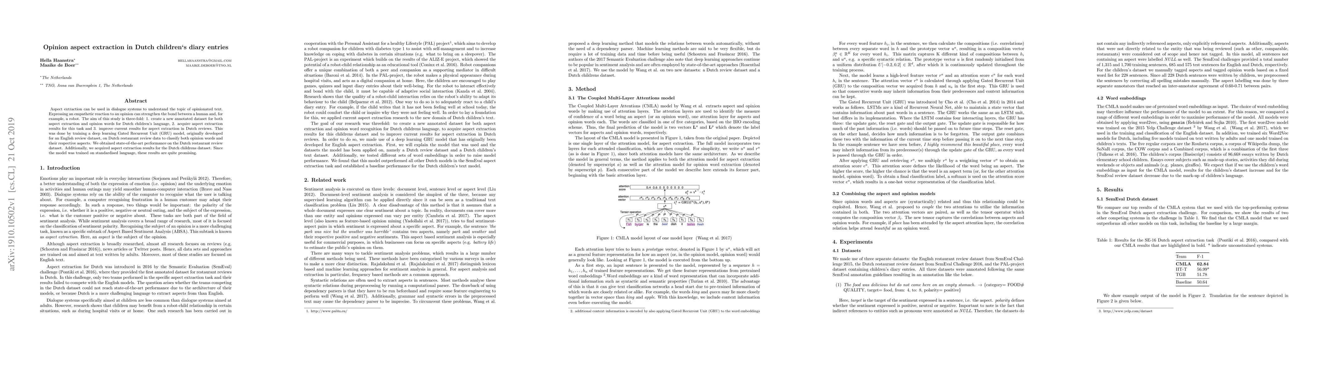 Aspect extraction can be used in dialogue systems to understand the topic of opinionated text. Expressing an empathetic reaction to an opinion can strengthen the bond between a human and, for example, a robot. The aim of this study is three-fold: 1. create a new annotated dataset for both aspect extraction and opinion words for Dutch childrens language, 2. acquire aspect extraction results for this task and 3. improve current results for aspect extraction in Dutch reviews. This was done by training a deep learning Gated Recurrent Unit (GRU) model, originally developed for an English review dataset, on Dutch restaurant review data to classify both opinion words and their respective aspects. We obtained state-of-the-art performance on the Dutch restaurant review dataset. Additionally, we acquired aspect extraction results for the Dutch childrens dataset. Since the model was trained on standardised language, these results are quite promising.