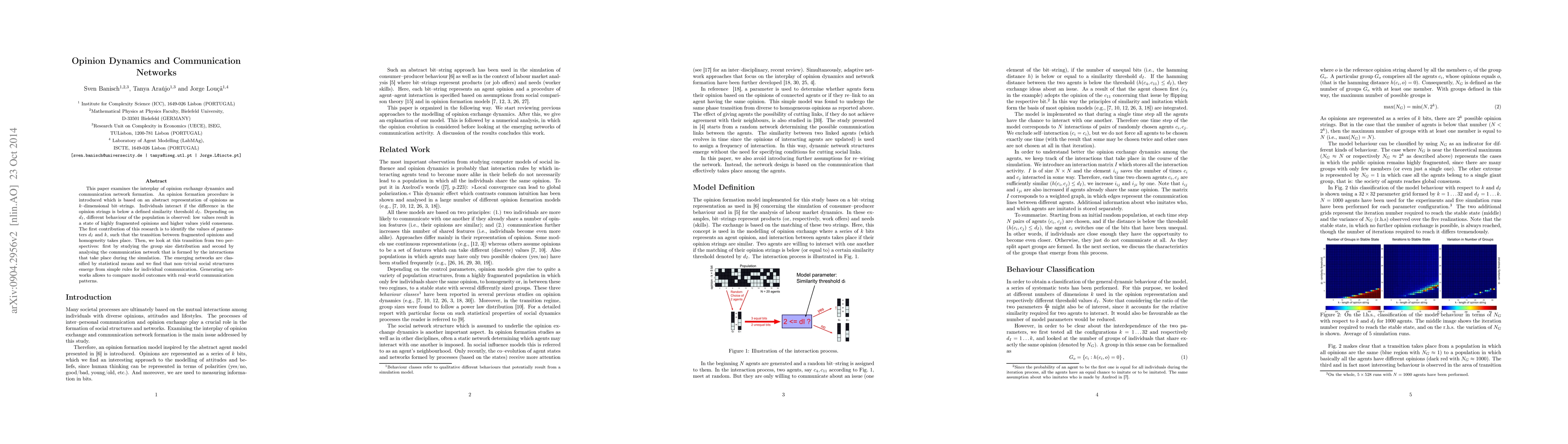 This paper examines the interplay of opinion exchange dynamics and communication network formation. An opinion formation procedure is introduced which is based on an abstract representation of opinions as $k$--dimensional bit--strings. Individuals interact if the difference in the opinion strings is below a defined similarity threshold $d_I$. Depending on $d_I$, different behaviour of the population is observed: low values result in a state of highly fragmented opinions and higher values yield consensus. The first contribution of this research is to identify the values of parameters $d_I$ and $k$, such that the transition between fragmented opinions and homogeneity takes place. Then, we look at this transition from two perspectives: first by studying the group size distribution and second by analysing the communication network that is formed by the interactions that take place during the simulation. The emerging networks are classified by statistical means and we find that non--trivial social structures emerge from simple rules for individual communication. Generating networks allows to compare model outcomes with real--world communication patterns.