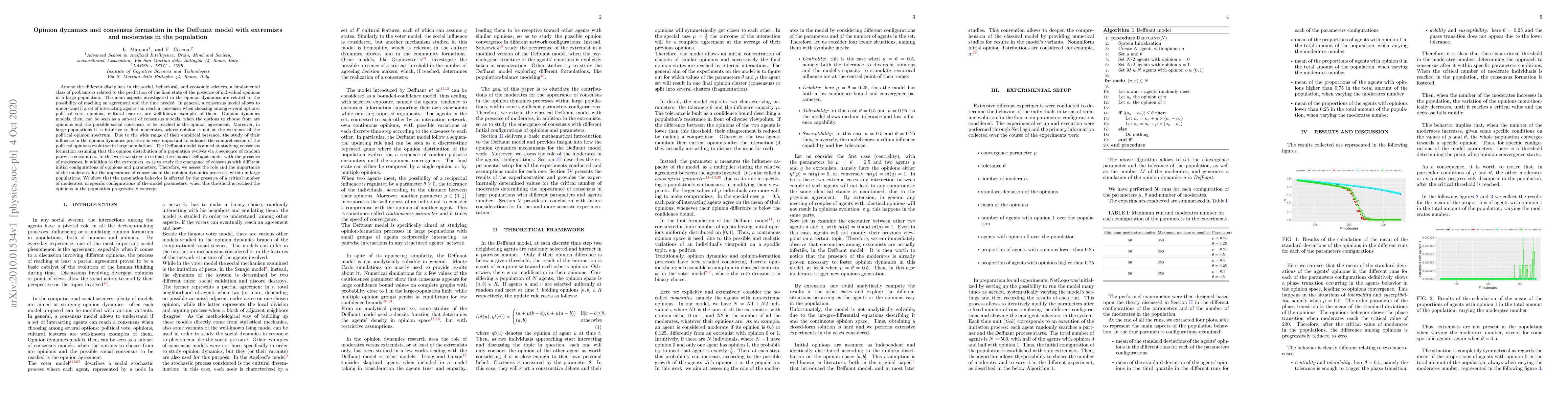 This paper extends the Deffuant model to include moderates alongside extremists, examining consensus formation in large populations. It finds that a critical number of moderates can significantly influence consensus emergence, with opinions progressively converging when this threshold is met.