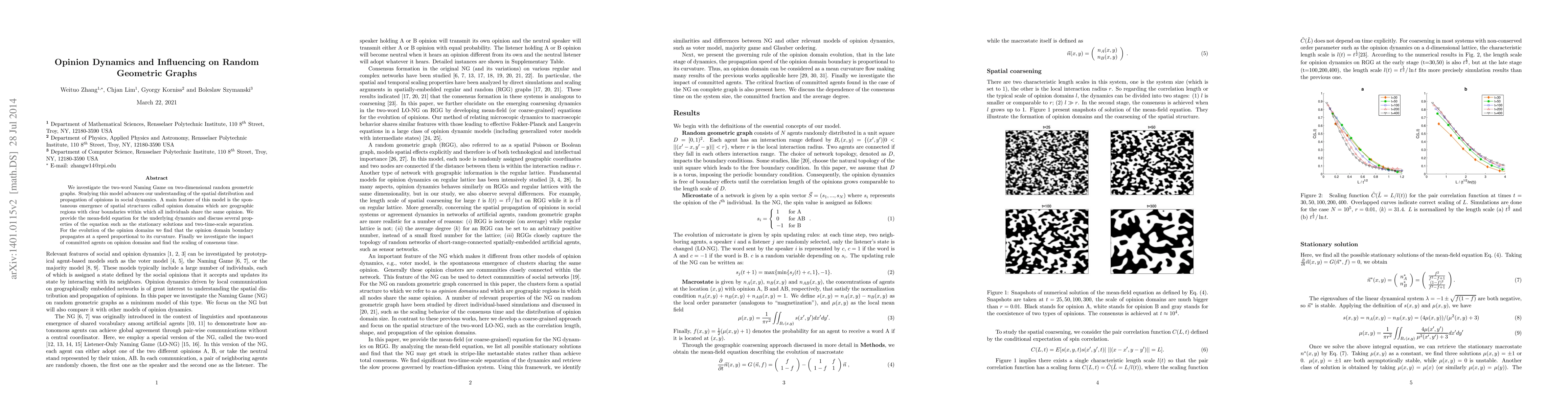 This paper studies the Naming Game on random geometric graphs to understand opinion dynamics and spatial opinion distribution. It reveals the emergence of opinion domains and provides a mean-field equation for the dynamics, showing that opinion domain boundaries propagate proportionally to their curvature, and examines the influence of committed agents on consensus time.