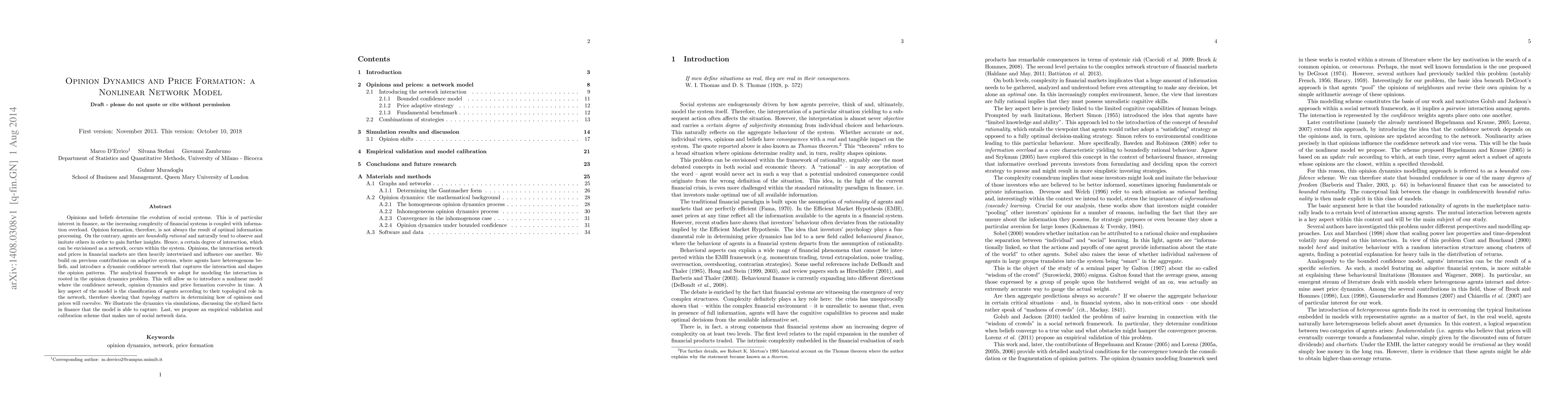 This paper develops a nonlinear network model to explore the interplay between opinion dynamics, interaction networks, and price formation in financial markets, emphasizing the role of bounded rationality and confidence networks. The model classifies agents based on their network topology, demonstrating its impact on opinion and price evolution, and validates the approach using social network data.