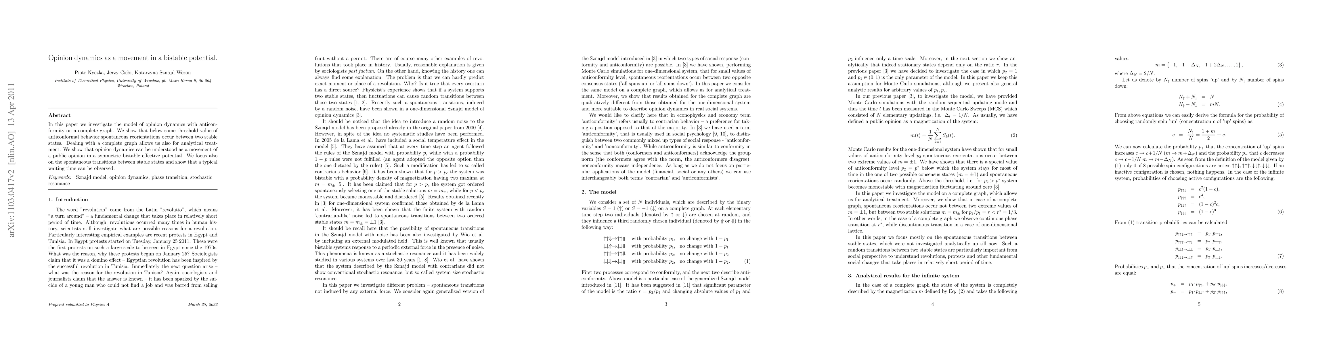 This paper explores opinion dynamics on a complete graph, demonstrating that below a certain threshold of anticonformity, spontaneous transitions between two stable opinion states occur. It models public opinion as a movement in a bistable potential, highlighting the presence of typical waiting times for these transitions.