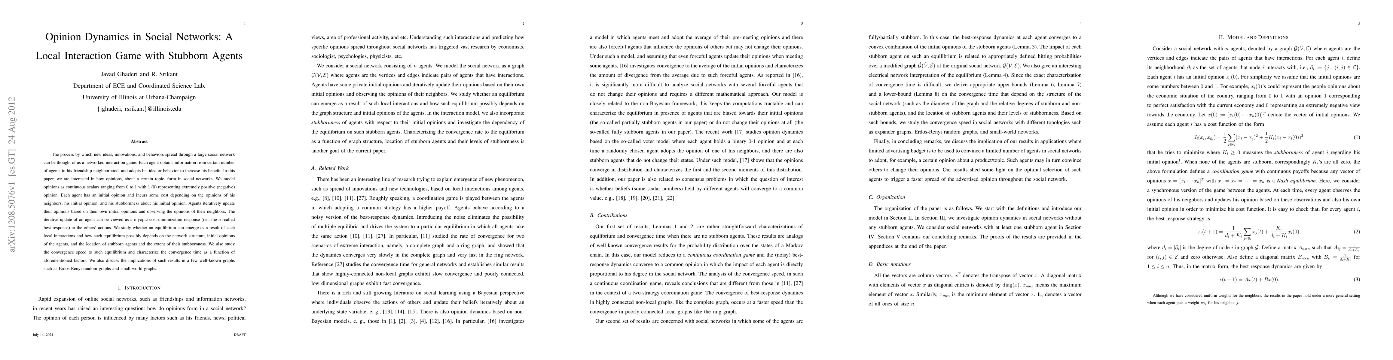 This paper explores opinion dynamics in social networks through a local interaction game where agents update their opinions based on neighbors' opinions and their own stubbornness. It investigates the emergence of equilibrium, the impact of network structure, initial opinions, and stubborn agents, and the convergence speed to equilibrium in various graph types.