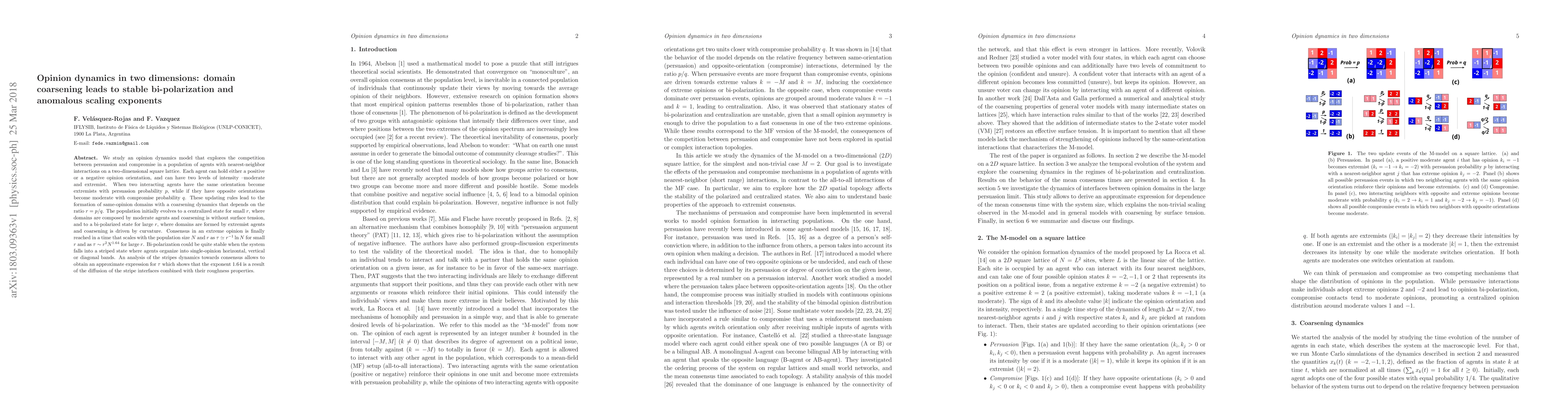 We study an opinion dynamics model that explores the competition between persuasion and compromise in a population of agents with nearest-neighbor interactions on a two-dimensional square lattice. Each agent can hold either a positive or a negative opinion orientation, and can have two levels of intensity --moderate and extremist. When two interacting agents have the same orientation become extremists with persuasion probability $p$, while if they have opposite orientations become moderate with compromise probability $q$. These updating rules lead to the formation of same-opinion domains with a coarsening dynamics that depends on the ratio $r=p/q$. The population initially evolves to a centralized state for small $r$, where domains are composed by moderate agents and coarsening is without surface tension, and to a bi-polarized state for large $r$, where domains are formed by extremist agents and coarsening is driven by curvature. Consensus in an extreme opinion is finally reached in a time that scales with the population size $N$ and $r$ as $\tau \simeq r^{-1} \ln N$ for small $r$ and as $\tau \sim r^2 N^{1.64}$ for large $r$. Bi-polarization could be quite stable when the system falls into a striped state where agents organize into single-opinion horizontal, vertical or diagonal bands. An analysis of the stripes dynamics towards consensus allows to obtain an approximate expression for $\tau$ which shows that the exponent $1.64$ is a result of the diffusion of the stripe interfaces combined with their roughness properties.