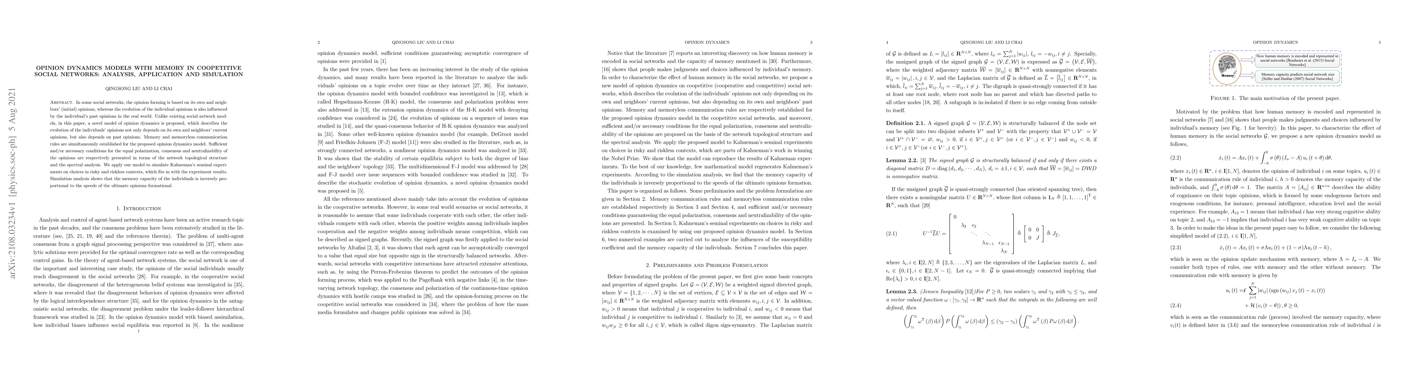 In some social networks, the opinion forming is based on its own and neighbors' (initial) opinions, whereas the evolution of the individual opinions is also influenced by the individual's past opinions in the real world. Unlike existing social network models, in this paper, a novel model of opinion dynamics is proposed, which describes the evolution of the individuals' opinions not only depends on its own and neighbors' current opinions, but also depends on past opinions. Memory and memoryless communication rules are simultaneously established for the proposed opinion dynamics model. Sufficient and/or necessary conditions for the equal polarization, consensus and neutralizability of the opinions are respectively presented in terms of the network topological structure and the spectral analysis. We apply our model to simulate Kahneman's seminal experiments on choices in risky and riskless contexts, which fits in with the experiment results. Simulation analysis shows that the memory capacity of the individuals is inversely proportional to the speeds of the ultimate opinions formational.