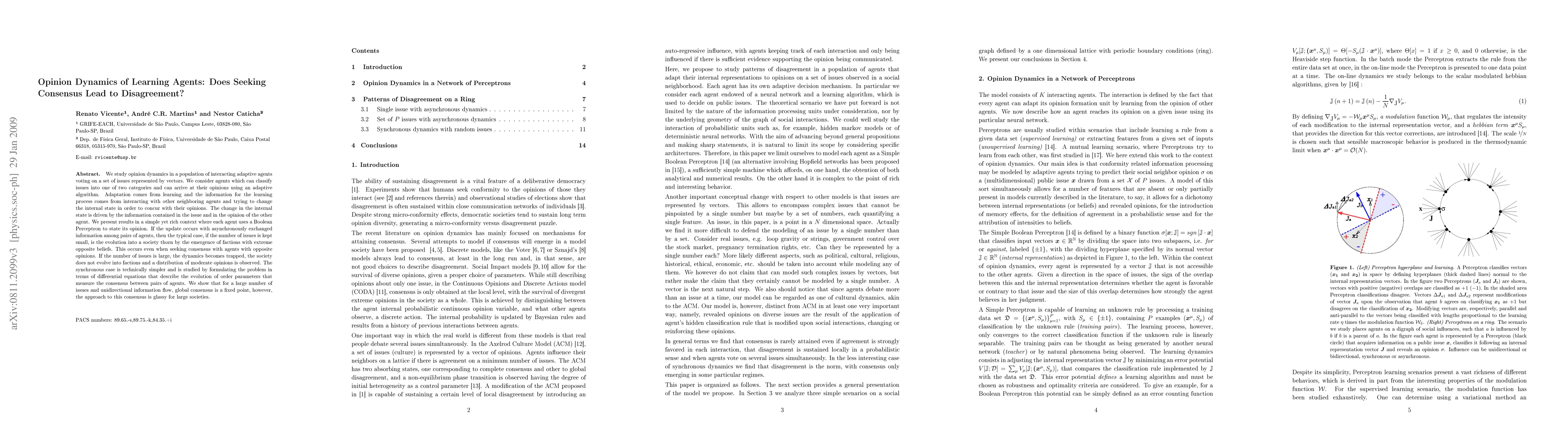 We study opinion dynamics in a population of interacting adaptive agents voting on a set of complex multidimensional issues. We consider agents which can classify issues into for or against. The agents arrive at the opinions about each issue in question using an adaptive algorithm. Adaptation comes from learning and the information for the learning process comes from interacting with other neighboring agents and trying to change the internal state in order to concur with their opinions. The change in the internal state is driven by the information contained in the issue and in the opinion of the other agent. We present results in a simple yet rich context where each agent uses a Boolean Perceptron to state its opinion. If there is no internal clock, so the update occurs with asynchronously exchanged information among pairs of agents, then the typical case, if the number of issues is kept small, is the evolution into a society thorn by the emergence of factions with extreme opposite beliefs. This occurs even when seeking consensus with agents with opposite opinions. The curious result is that it is learning from those that hold the same opinions that drives the emergence of factions. This results follows from the fact that factions are prevented by not learning at all from those agents that hold the same opinion. If the number of issues is large, the dynamics becomes trapped and the society does not evolve into factions and a distribution of moderate opinions is observed. We also study the less realistic, but technically simpler synchronous case showing that global consensus is a fixed point. However, the approach to this consensus is glassy in the limit of large societies if agents adapt even in the case of agreement.