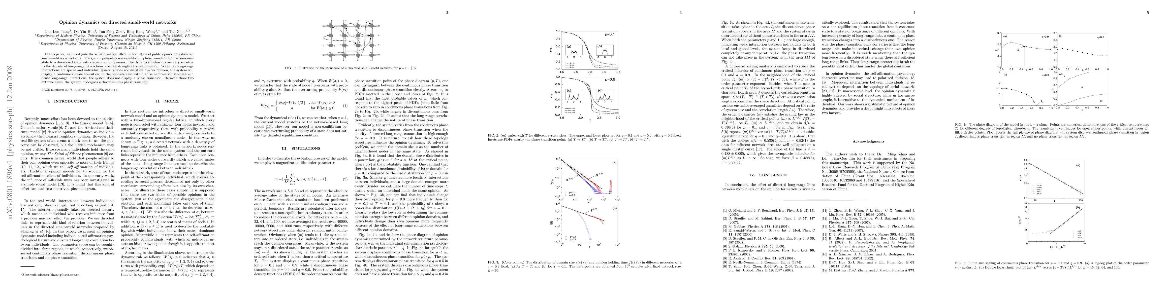 This paper examines how public opinion forms in directed small-world networks, highlighting a self-affirmation effect that leads to a non-equilibrium phase transition. The study finds that the system's dynamics depend critically on the density of long-range interactions and the strength of self-affirmation, resulting in continuous, discontinuous, or no phase transitions under different conditions.