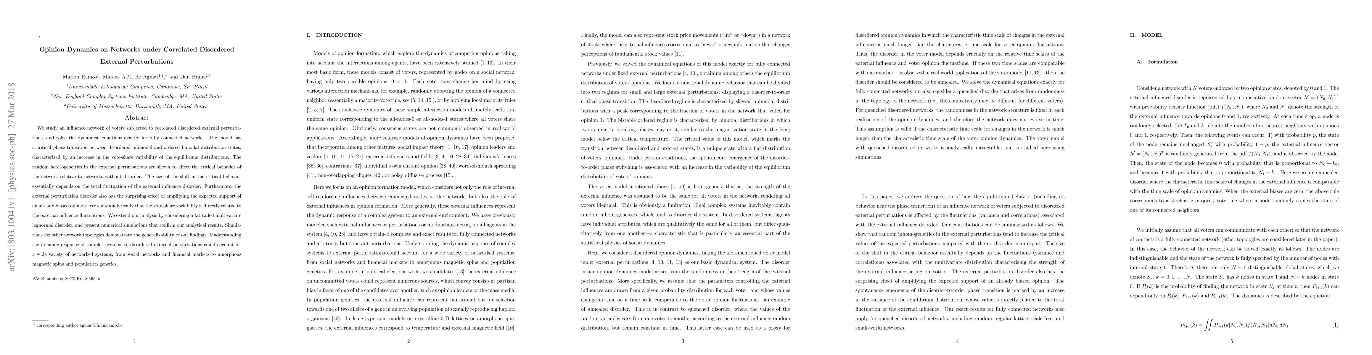 This paper investigates the dynamics of voter opinions in networks under correlated disordered external perturbations, revealing a critical phase transition and showing how these perturbations amplify biased opinions. Analytical and numerical results demonstrate the impact of external influence fluctuations on vote-share variability and the generalizability of findings across different network topologies.