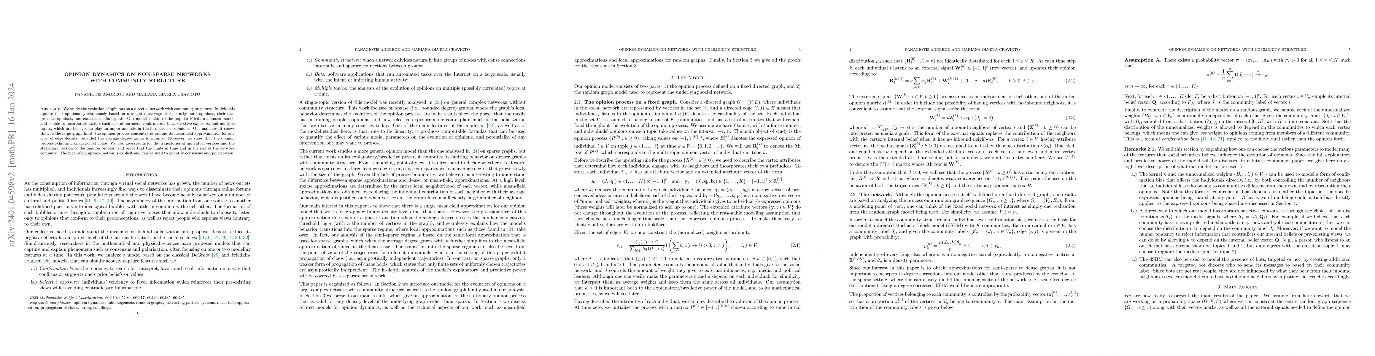 This paper investigates opinion dynamics on directed networks with community structures, employing a model similar to the Friedkin-Johnsen model that incorporates factors like stubbornness and confirmation bias. It demonstrates that the opinion process converges to a mean-field approximation and exhibits propagation of chaos, even as edge density varies.