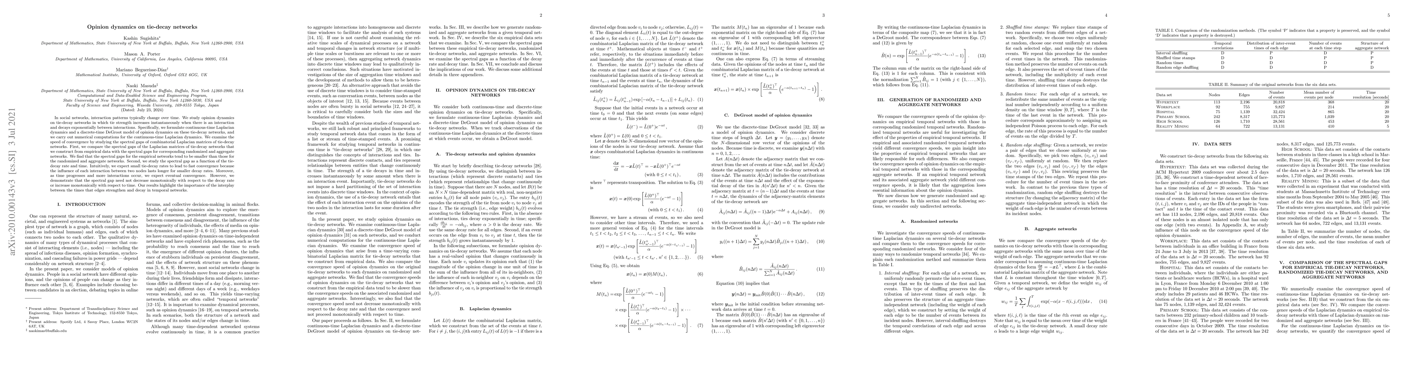 This paper investigates opinion dynamics on tie-decay networks where interactions strengthen ties momentarily and decay over time. It examines both continuous-time Laplacian dynamics and discrete-time DeGroot models, finding that the spectral gap of tie-decay networks is often smaller than in randomized or aggregate networks, emphasizing the impact of temporal edge dynamics on convergence speed.