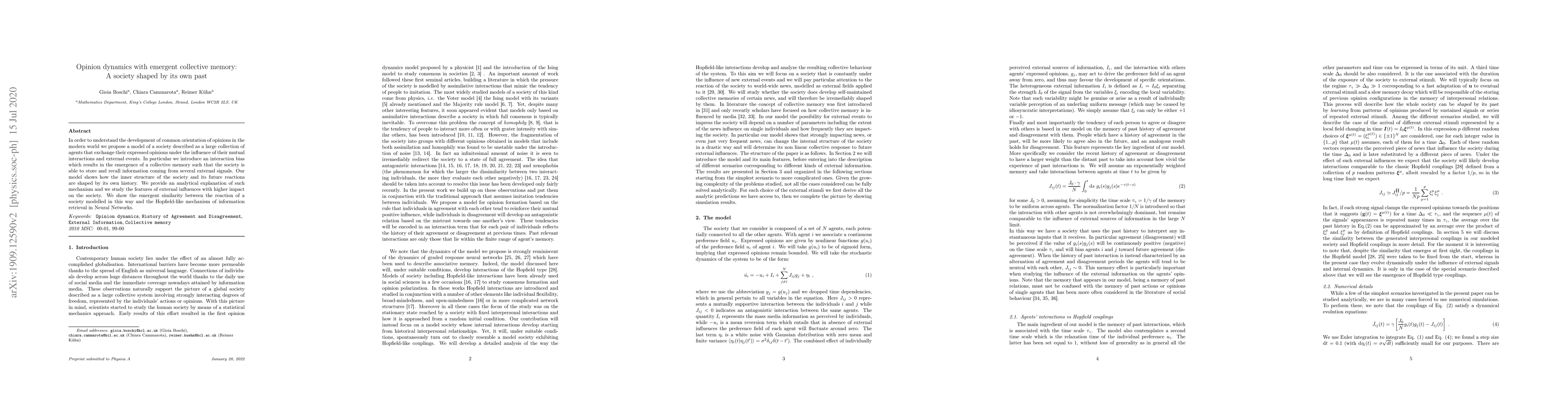 In order to understand the development of common orientation of opinions in the modern world we propose a model of a society described as a large collection of agents that exchange their expressed opinions under the influence of their mutual interactions and external events. In particular we introduce an interaction bias which creates a collective memory effect such that the society is able to store and recall information coming from several external signals. Our model shows how the inner structure of the society and its future reactions can be shaped by its own history. We will provide an analytical explanation of how this might occur and we will show the emergent similarity between the reaction of a society modelled in this way and the Hopfield mechanism for information retrieval.