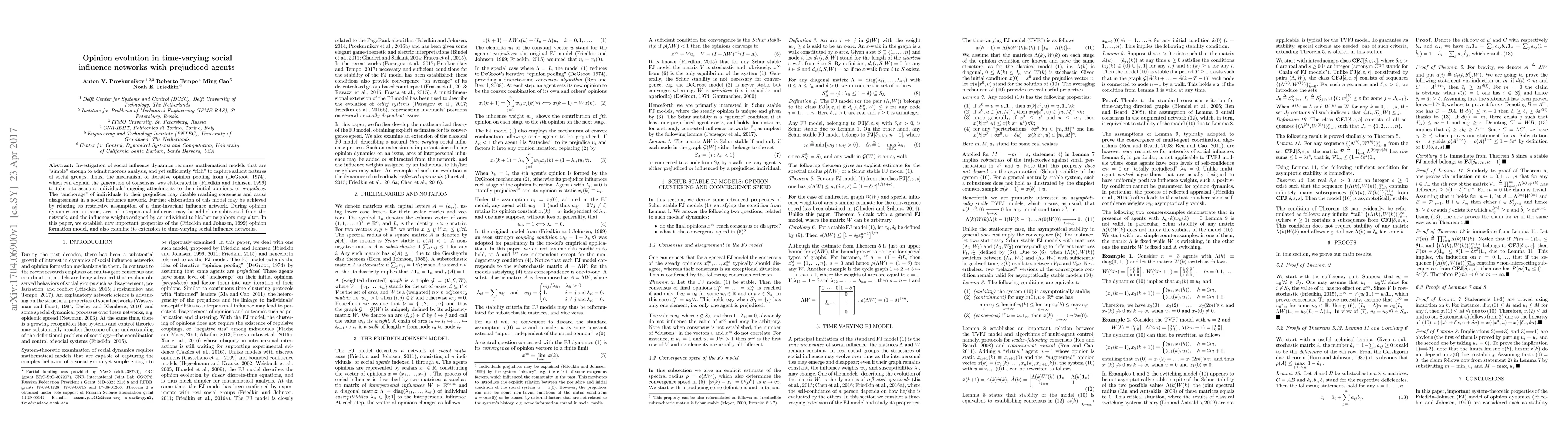Investigation of social influence dynamics requires mathematical models that are "simple" enough to admit rigorous analysis, and yet sufficiently "rich" to capture salient features of social groups. Thus, the mechanism of iterative opinion pooling from (DeGroot, 1974), which can explain the generation of consensus, was elaborated in (Friedkin and Johnsen, 1999) to take into account individuals' ongoing attachments to their initial opinions, or prejudices. The "anchorage" of individuals to their prejudices may disable reaching consensus and cause disagreement in a social influence network. Further elaboration of this model may be achieved by relaxing its restrictive assumption of a time-invariant influence network. During opinion dynamics on an issue, arcs of interpersonal influence may be added or subtracted from the network, and the influence weights assigned by an individual to his/her neighbors may alter. In this paper, we establish new important properties of the (Friedkin and Johnsen, 1999) opinion formation model, and also examine its extension to time-varying social influence networks.