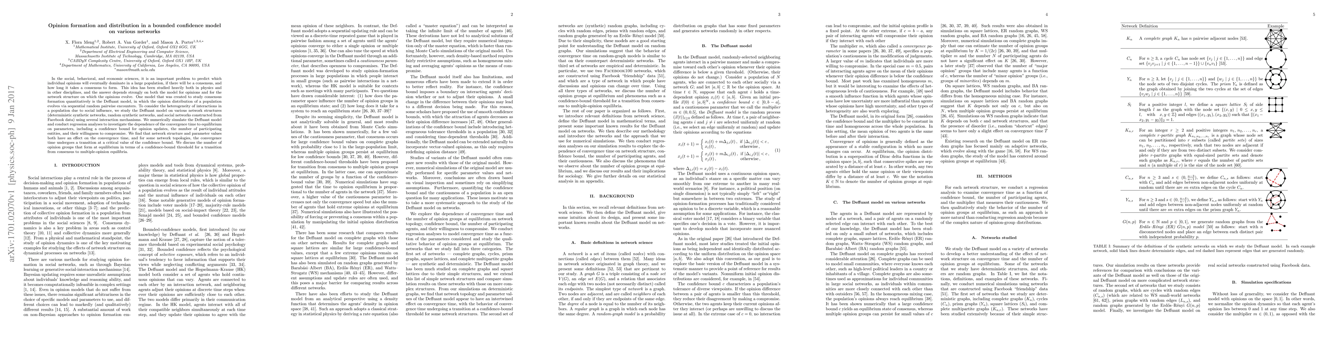 In the social, behavioral, and economic sciences, it is an important problem to predict which individual opinions will eventually dominate in a large population, if there will be a consensus, and how long it takes a consensus to form. This idea has been studied heavily both in physics and in other disciplines, and the answer depends strongly on both the model for opinions and for the network structure on which the opinions evolve. One model that was created to study consensus formation quantitatively is the Deffuant model, in which the opinion distribution of a population evolves via sequential random pairwise encounters. To consider the heterogeneity of interactions in a population due to social influence, we study the Deffuant model on various network structures (deterministic synthetic networks, random synthetic networks, and social networks constructed from Facebook data) using several interaction mechanisms. We numerically simulate the Deffuant model and conduct regression analyses to investigate the dependence of the convergence time to equilibrium on parameters, including a confidence bound for opinion updates, the number of participating entities, and their willingness to compromise. We find that network structure and parameter values both have an effect on the convergence time, and for some network topologies, the convergence time undergoes a transition at a critical value of the confidence bound. We discuss the number of opinion groups that form at equilibrium in terms of a confidence-bound threshold for a transition from consensus to multiple-opinion equilibria.