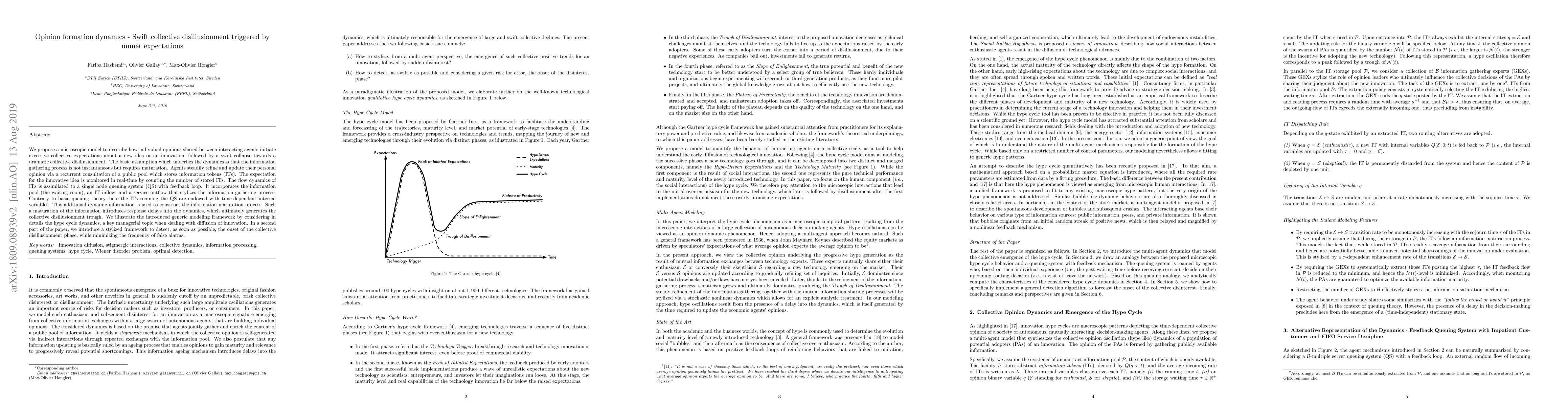 We propose a microscopic model to describe how individual opinions shared between interacting agents initiate excessive collective expectations about a new idea or an innovation, followed by a swift collapse towards a dramatic collective disillusionment. The basic assumption which underlies the dynamics is that the information gathering process is not instantaneous but requires maturation. Agents steadily refine and update their personal opinion via a recurrent consultation of a public pool which stores information tokens (ITs). The expectation for the innovative idea is monitored in real-time by counting the number of stored ITs. The flow dynamics of ITs is assimilated to a single node queuing system (QS) with feedback loop. It incorporates the information pool (the waiting room), an IT inflow, and a service outflow that stylizes the information gathering process. Contrary to basic queuing theory, here the ITs roaming the QS are endowed with time-dependent internal variables. This additional dynamic information is used to construct the information maturation process. Such a maturation of the information introduces response delays into the dynamics, which ultimately generates the collective disillusionment trough. We illustrate the introduced generic modeling framework by considering in details the hype cycle dynamics, a key managerial topic when dealing with diffusion of innovation. In a second part of the paper, we introduce a stylized framework to detect, as soon as possible, the onset of the collective disillusionment phase, while minimizing the frequency of false alarms.