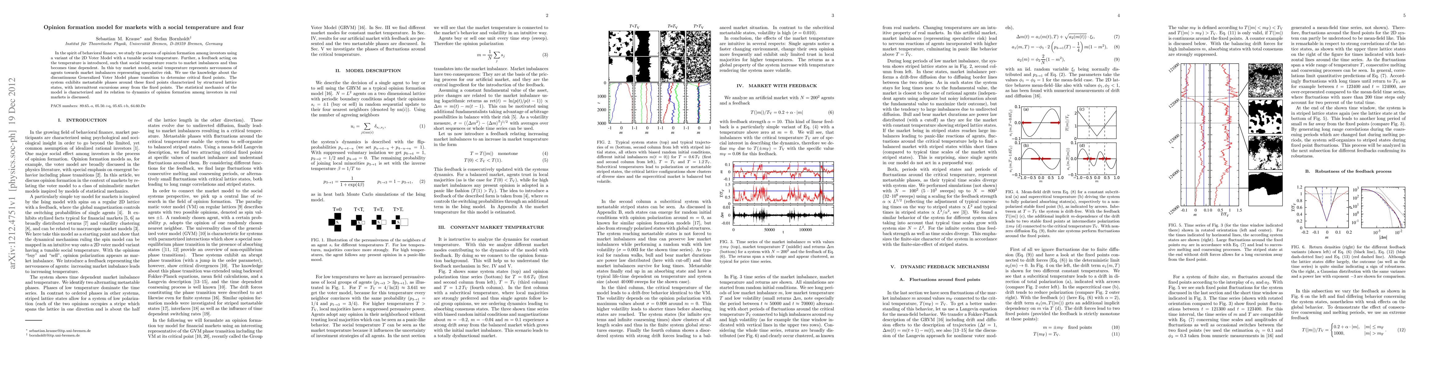 In the spirit of behavioral finance, we study the process of opinion formation among investors using a variant of the 2D Voter Model with a tunable social temperature. Further, a feedback acting on the temperature is introduced, such that social temperature reacts to market imbalances and thus becomes time dependent. In this toy market model, social temperature represents nervousness of agents towards market imbalances representing speculative risk. We use the knowledge about the discontinuous Generalized Voter Model phase transition to determine critical fixed points. The system exhibits metastable phases around these fixed points characterized by structured lattice states, with intermittent excursions away from the fixed points. The statistical mechanics of the model is characterized and its relation to dynamics of opinion formation among investors in real markets is discussed.