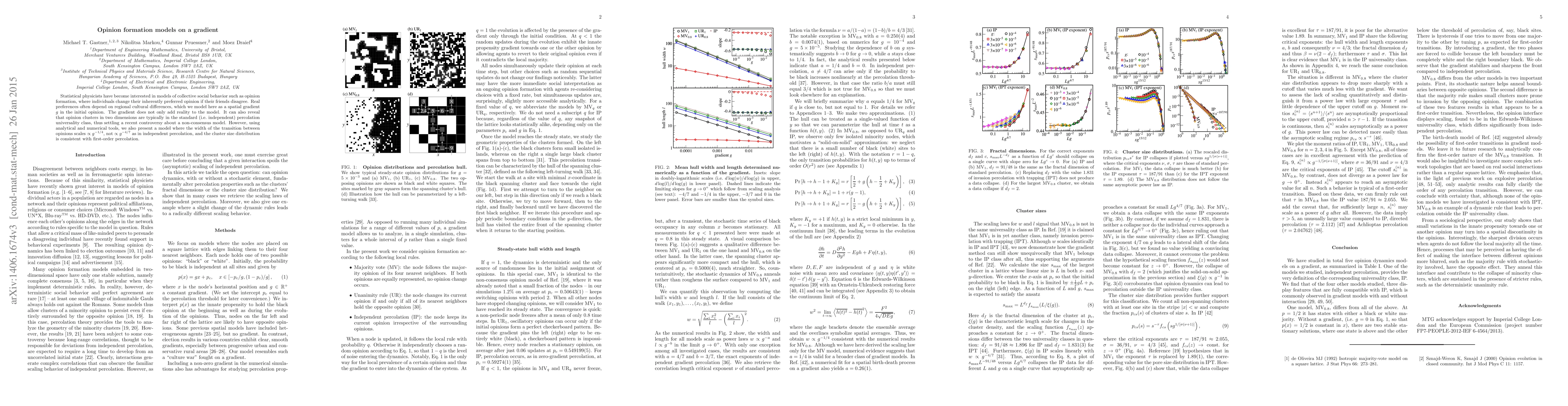 This paper models opinion formation influenced by spatial gradients in initial opinions, revealing that opinion clusters typically follow independent percolation. However, it also presents a variant where the transition width scales differently, aligning with first-order percolation.