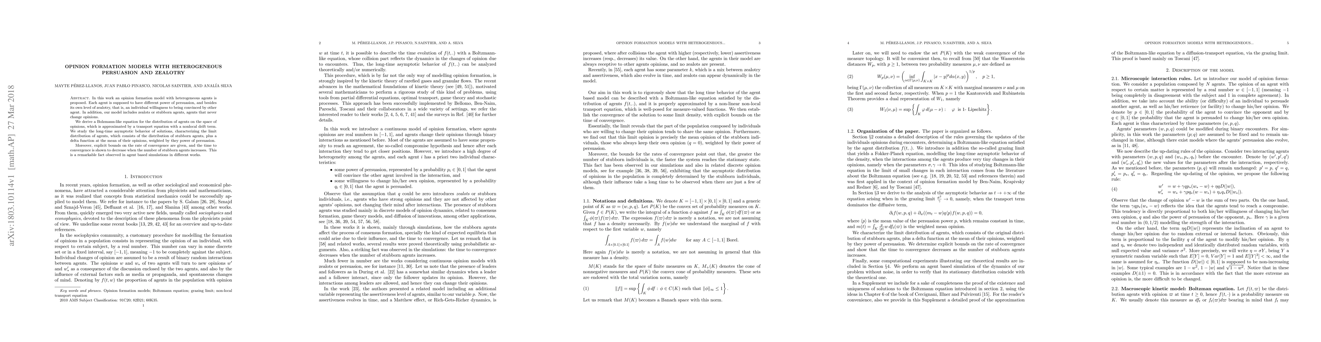 This research proposes an opinion formation model with heterogeneous agents, each having distinct persuasion power and varying levels of zealotry. The study derives a transport equation for the distribution of opinions, revealing that the long-term distribution includes stubborn agents and a delta function weighted by their persuasion power, with convergence time decreasing as the number of stubborn agents increases.