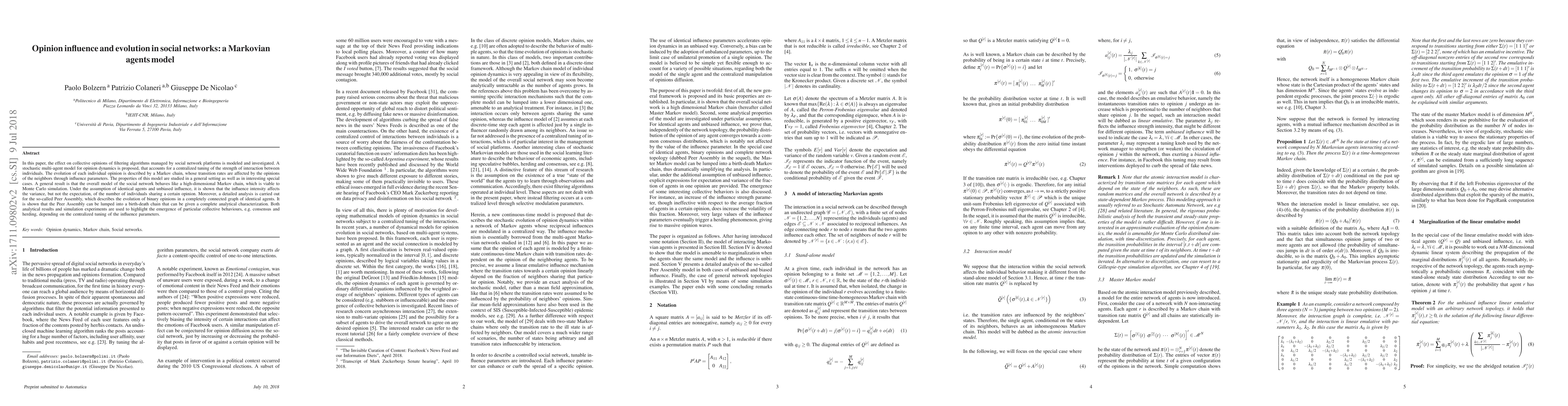 In this paper, the effect on collective opinions of filtering algorithms managed by social network platforms is modeled and investigated. A stochastic multi-agent model for opinion dynamics is proposed, that accounts for a centralized tuning of the strength of interaction between individuals. The evolution of each individual opinion is described by a Markov chain, whose transition rates are affected by the opinions of the neighbors through influence parameters. The properties of this model are studied in a general setting as well as in interesting special cases. A general result is that the overall model of the social network behaves like a high-dimensional Markov chain, which is viable to Monte Carlo simulation. Under the assumption of identical agents and unbiased influence, it is shown that the influence intensity affects the variance, but not the expectation, of the number of individuals sharing a certain opinion. Moreover, a detailed analysis is carried out for the so-called Peer Assembly, which describes the evolution of binary opinions in a completely connected graph of identical agents. It is shown that the Peer Assembly can be lumped into a birth-death chain that can be given a complete analytical characterization. Both analytical results and simulation experiments are used to highlight the emergence of particular collective behaviours, e.g. consensus and herding, depending on the centralized tuning of the influence parameters.