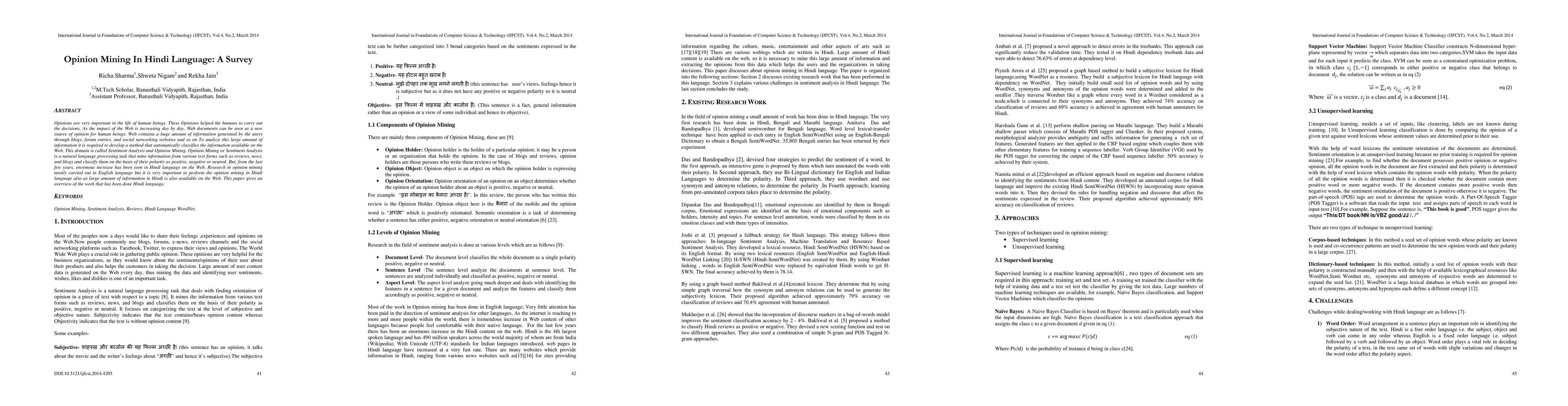 Opinions are very important in the life of human beings. These Opinions helped the humans to carry out the decisions. As the impact of the Web is increasing day by day, Web documents can be seen as a new source of opinion for human beings. Web contains a huge amount of information generated by the users through blogs, forum entries, and social networking websites and so on To analyze this large amount of information it is required to develop a method that automatically classifies the information available on the Web. This domain is called Sentiment Analysis and Opinion Mining. Opinion Mining or Sentiment Analysis is a natural language processing task that mine information from various text forms such as reviews, news, and blogs and classify them on the basis of their polarity as positive, negative or neutral. But, from the last few years, enormous increase has been seen in Hindi language on the Web. Research in opinion mining mostly carried out in English language but it is very important to perform the opinion mining in Hindi language also as large amount of information in Hindi is also available on the Web. This paper gives an overview of the work that has been done Hindi language.