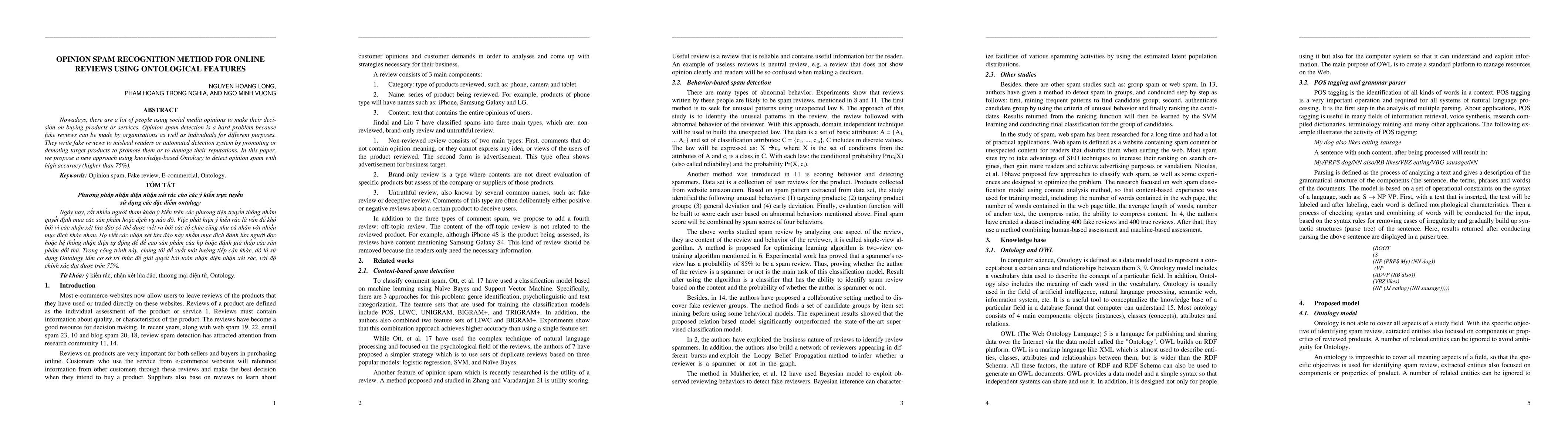 Nowadays, there are a lot of people using social media opinions to make their decision on buying products or services. Opinion spam detection is a hard problem because fake reviews can be made by organizations as well as individuals for different purposes. They write fake reviews to mislead readers or automated detection system by promoting or demoting target products to promote them or to damage their reputations. In this paper, we pro-pose a new approach using knowledge-based Ontology to detect opinion spam with high accuracy (higher than 75%). Keywords: Opinion spam, Fake review, E-commercial, Ontology.