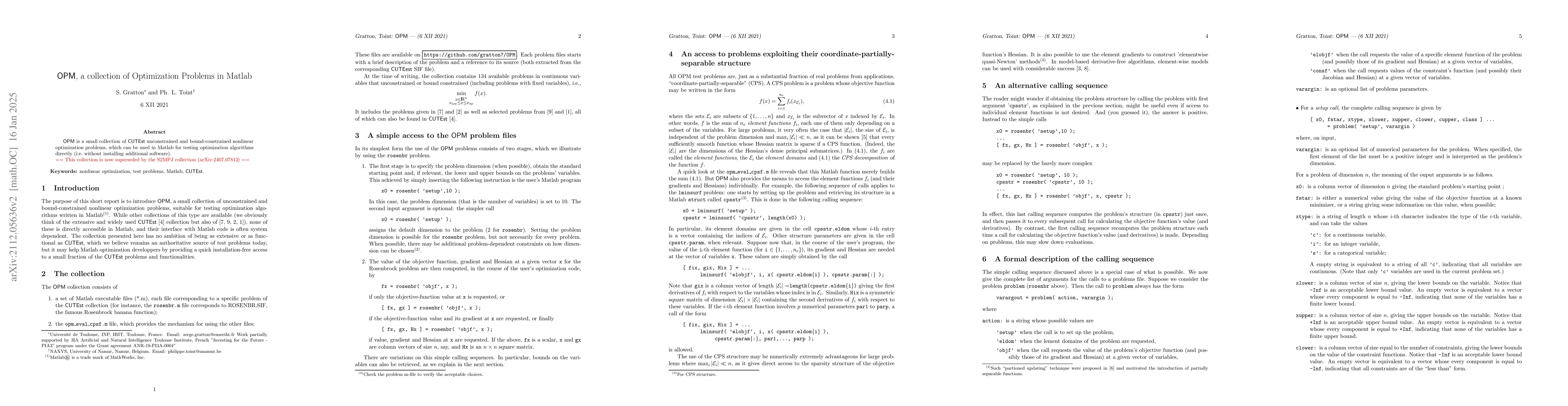 Summary: OPM is a Matlab-based collection of optimization problems for testing algorithms, featuring both unconstrained and bound-constrained nonlinear problems from the CUTEst library, eliminating the need for additional software installations.