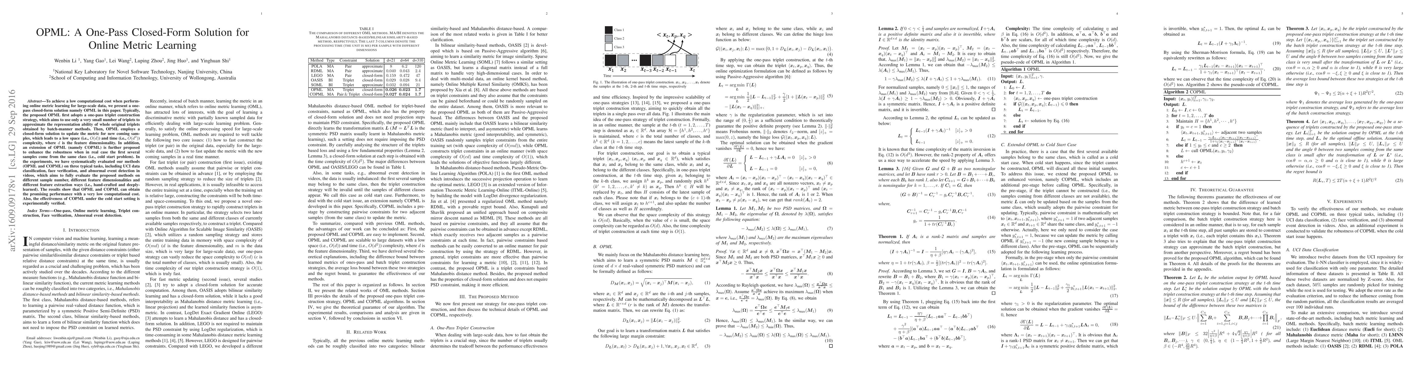 This paper introduces OPML, a one-pass closed-form solution for online metric learning, which uses a minimal number of triplets to approximate batch methods and updates metrics with low computational complexity. An extension, COPML, addresses the cold start problem for robustness. Experiments on various tasks demonstrate OPML and COPML's efficiency and effectiveness.