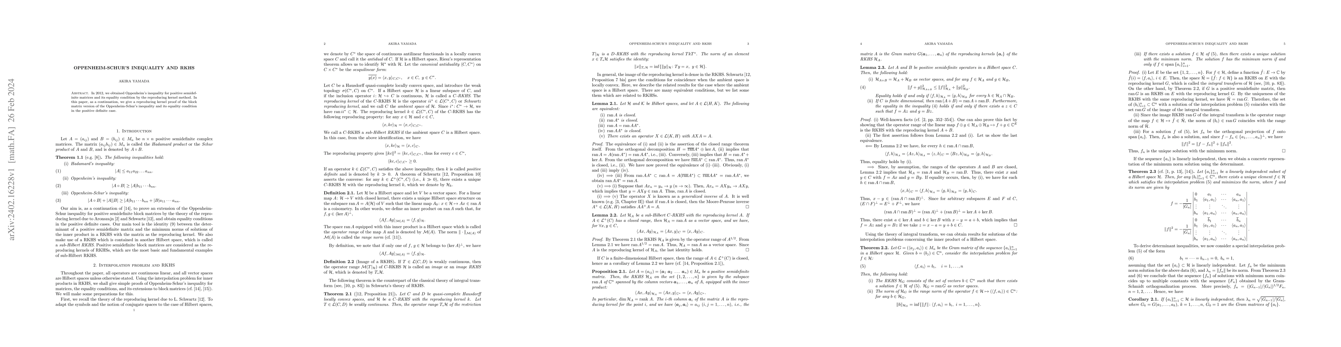 This paper extends the reproducing kernel method to prove the block matrix version of Oppenheim-Schur's inequality for positive definite matrices, establishing its equality condition. The approach builds on previous work that utilized the reproducing kernel Hilbert space (RKHS) to derive Oppenheim's inequality.