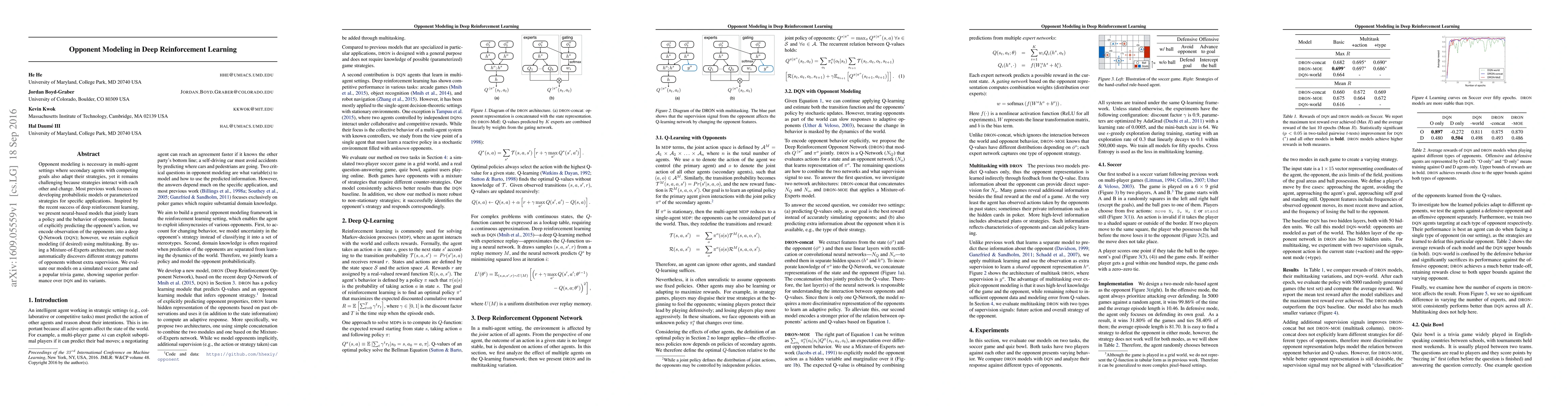 This paper proposes neural-based models for opponent modeling in deep reinforcement learning, using a Mixture-of-Experts architecture to discover opponents' strategy patterns without extra supervision. The approach encodes opponent observations into a deep Q-Network, demonstrating superior performance in simulated soccer and trivia games compared to traditional DQN methods.