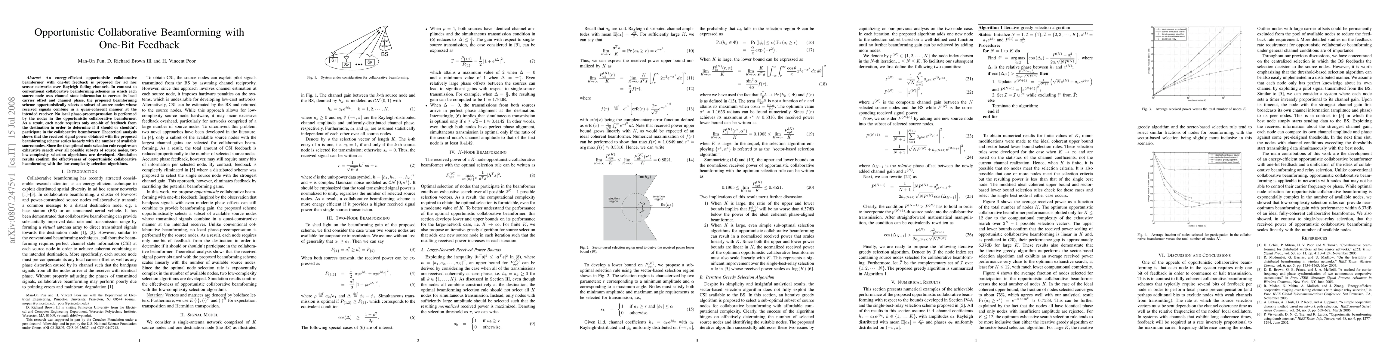 The paper presents an energy-efficient collaborative beamforming method with one-bit feedback and low-complexity selection algorithms for ad hoc sensor networks.